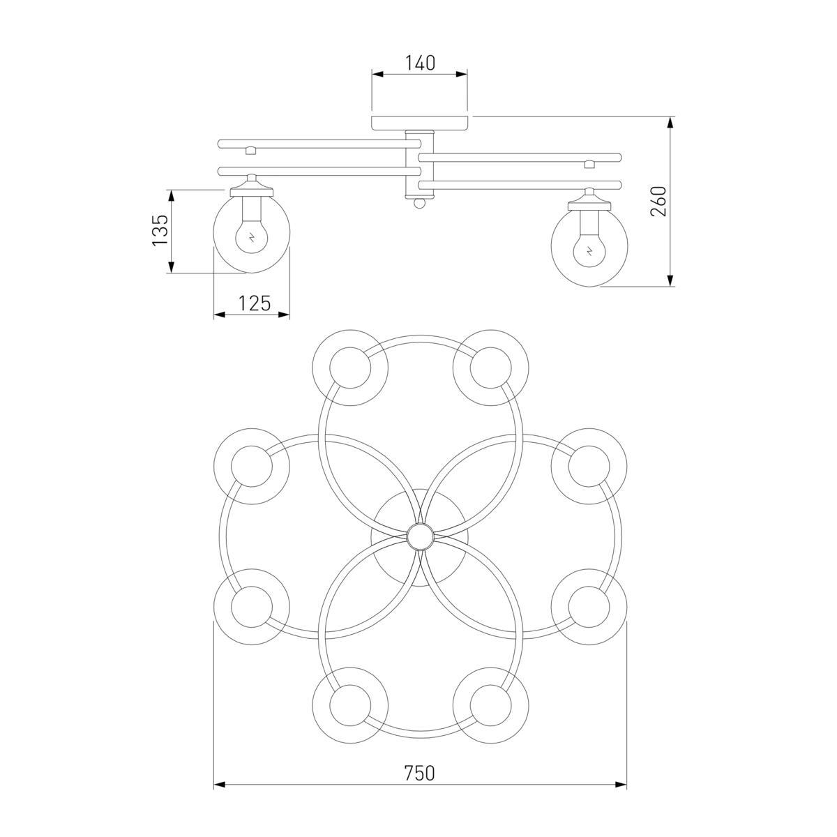 Производитель светильника рекомендует для устройства 8 ламп накаливания с цоколем E14 и мощностью 60 W, что позволит осветить помещение площадью кв.м. Габариты изделия: высота – 260 мм, диаметр – 750 мм.