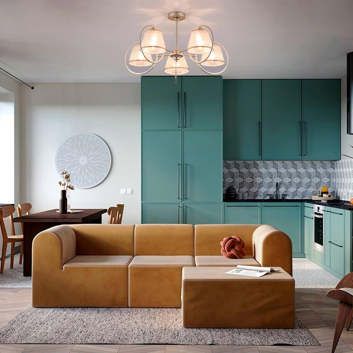 Потолочная люстра Eurosvet 60093/5 перламутровое золото от Российского бренда Eurosvet из коллекции Volante будет удачно смотреться в гостиной в неоклассическом стиле. Светильник выполнен из ткани с плафонами в форме конуса залотого цвета.