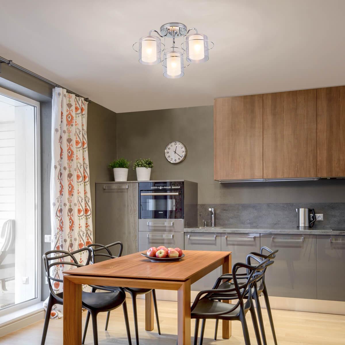 Потолочная люстра Eurosvet 30160/3 хром от Китайского бренда Eurosvet из коллекции Darcy будет удачно смотреться в кухне в стиле модерн. Светильник выполнен из стекла с плафонами в форме цилиндра белого цвета.
