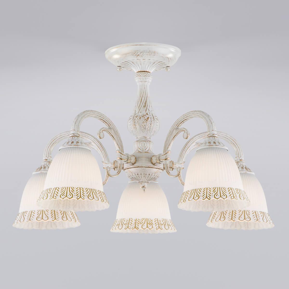 Потолочная люстра Eurosvet Campina 60107/5 белый с золотом от Китайского бренда Eurosvet из коллекции Campina будет удачно смотреться в спальни в стиле прованс. Светильник выполнен из стекла с плафонами в форме конуса белого цвета.