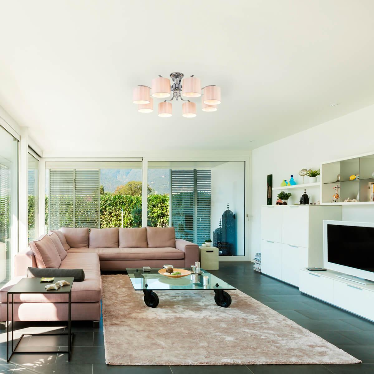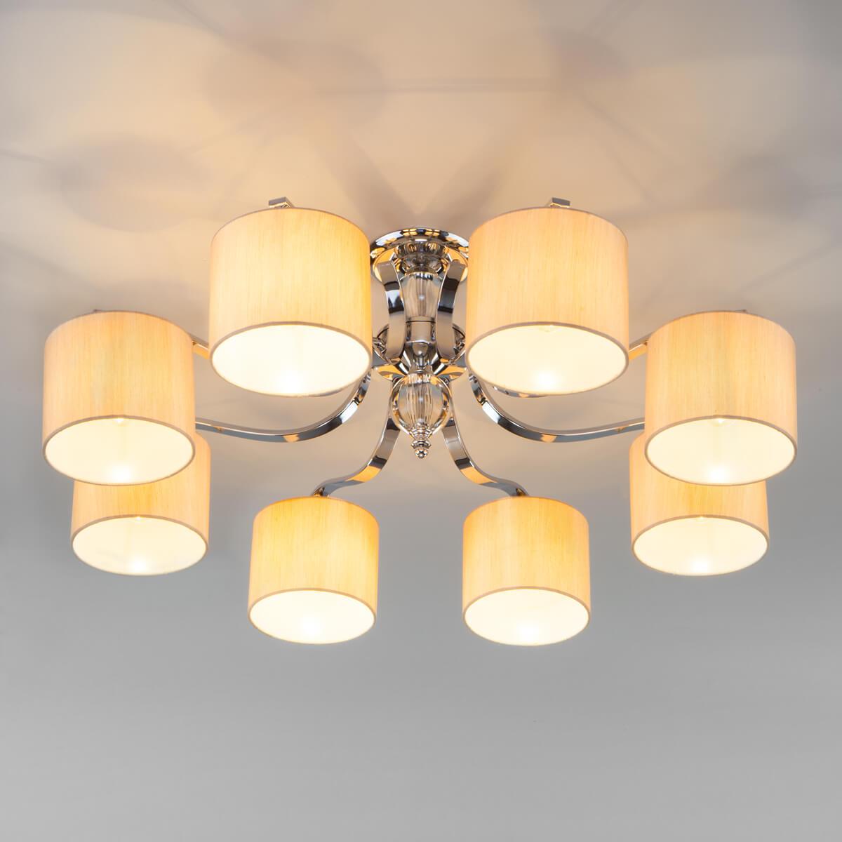 Потолочная люстра Eurosvet Shantel 60111/8 хром от Китайского бренда Eurosvet из коллекции Shantel будет удачно смотреться в гостиной в современном стиле. Светильник выполнен из ткани с плафонами в форме цилиндра бежевого цвета.