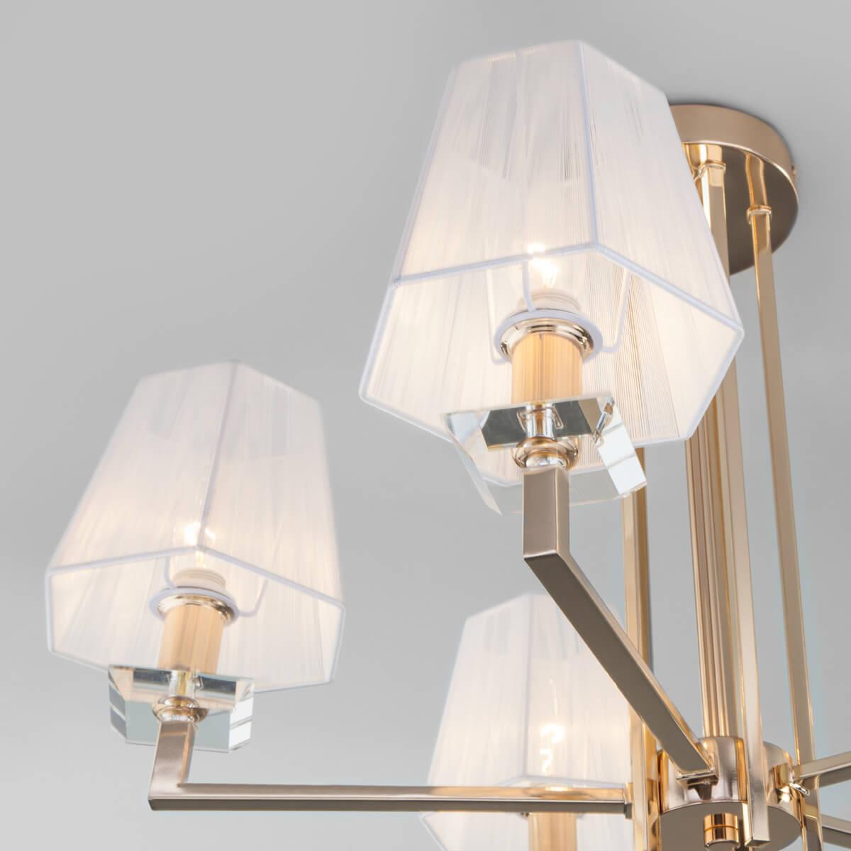 Потолочная люстра Eurosvet Alegria 60114/5 золото от бренда Eurosvet из коллекции Alegria будет удачно смотреться в спальни в стиле модерн. Светильник выполнен из ткани с плафонами в форме пирамиды белого цвета.