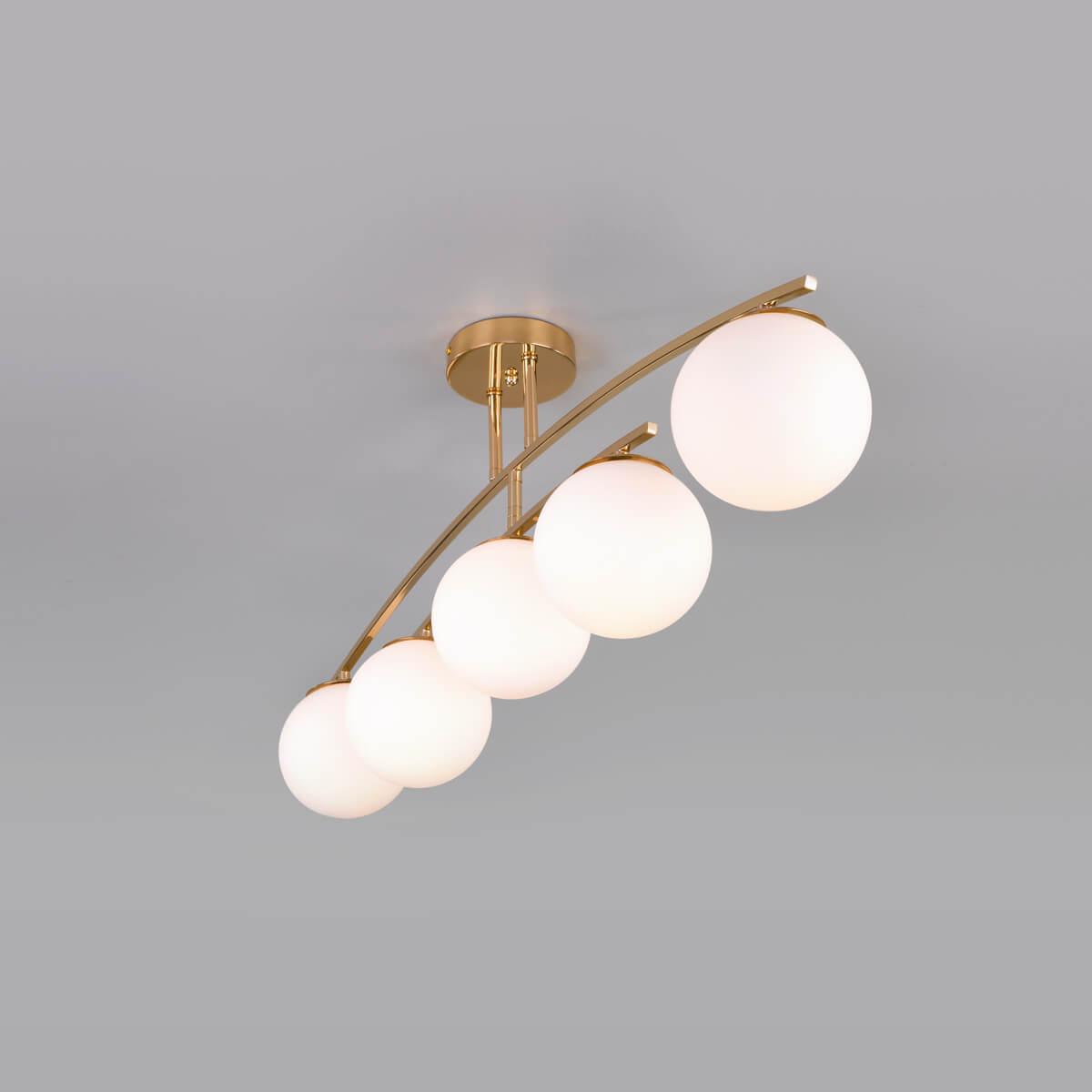 Потолочная люстра Eurosvet Bronx 30170/5 золото от Российского бренда Eurosvet из коллекции Bronx будет удачно смотреться в кухне в скандинавском стиле. Светильник выполнен из стекла с плафонами в форме шара белого цвета.