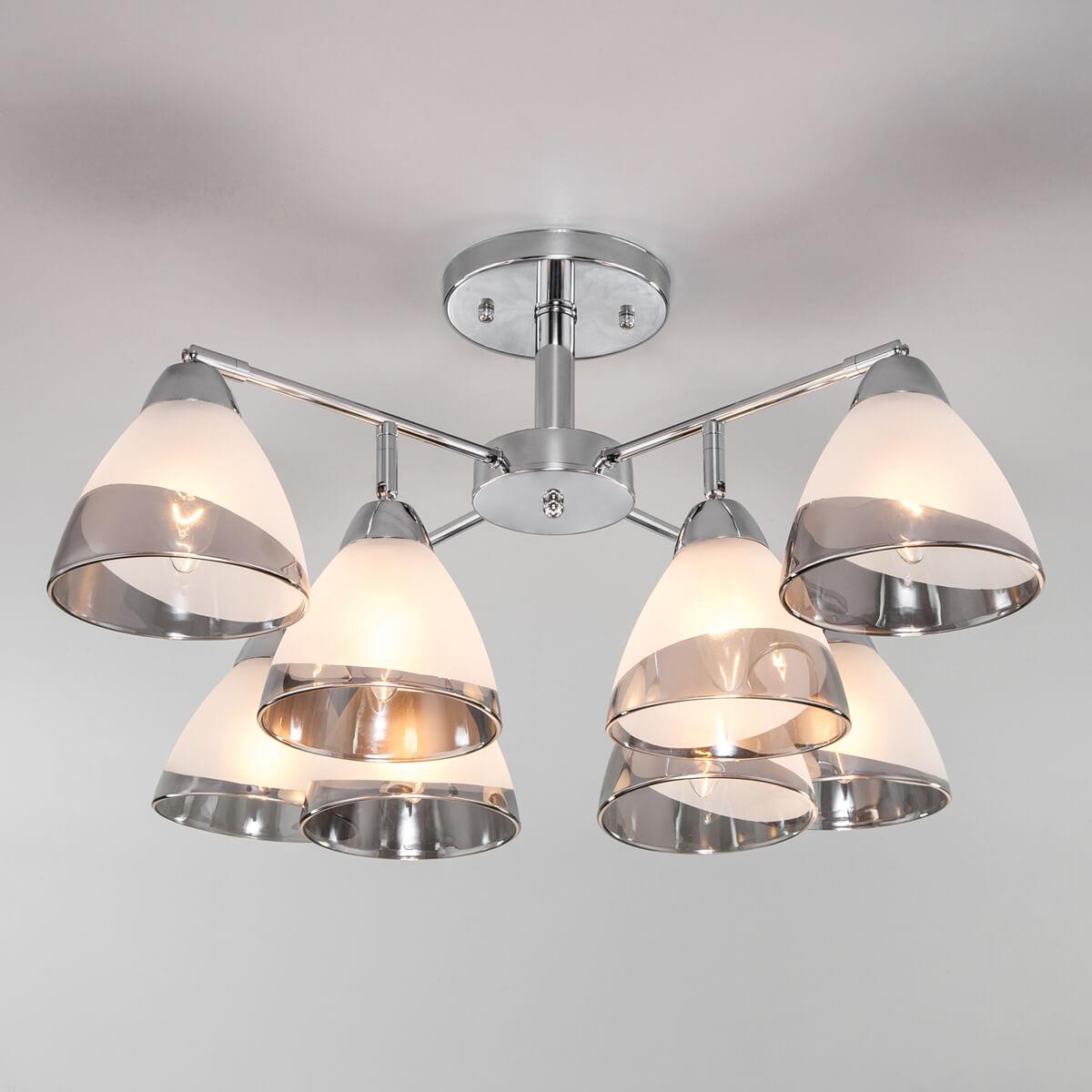 Потолочная люстра Eurosvet Paola 30126/8 хром от Китайского бренда Eurosvet из коллекции Paola будет удачно смотреться в гостиной в современном стиле. Светильник выполнен из стекла с плафонами в форме конуса белого цвета.