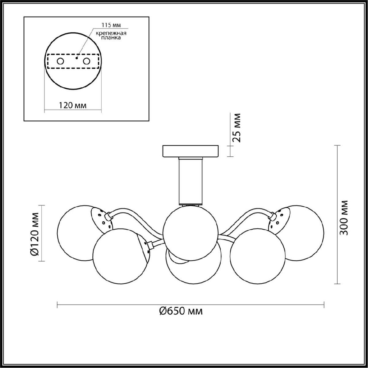 Производитель светильника рекомендует для устройства 6 ламп накаливания с цоколем E14 и мощностью 40 W, что позволит осветить помещение площадью 13,3 кв.м. Габариты изделия: высота – 300 мм, диаметр – 650 мм.