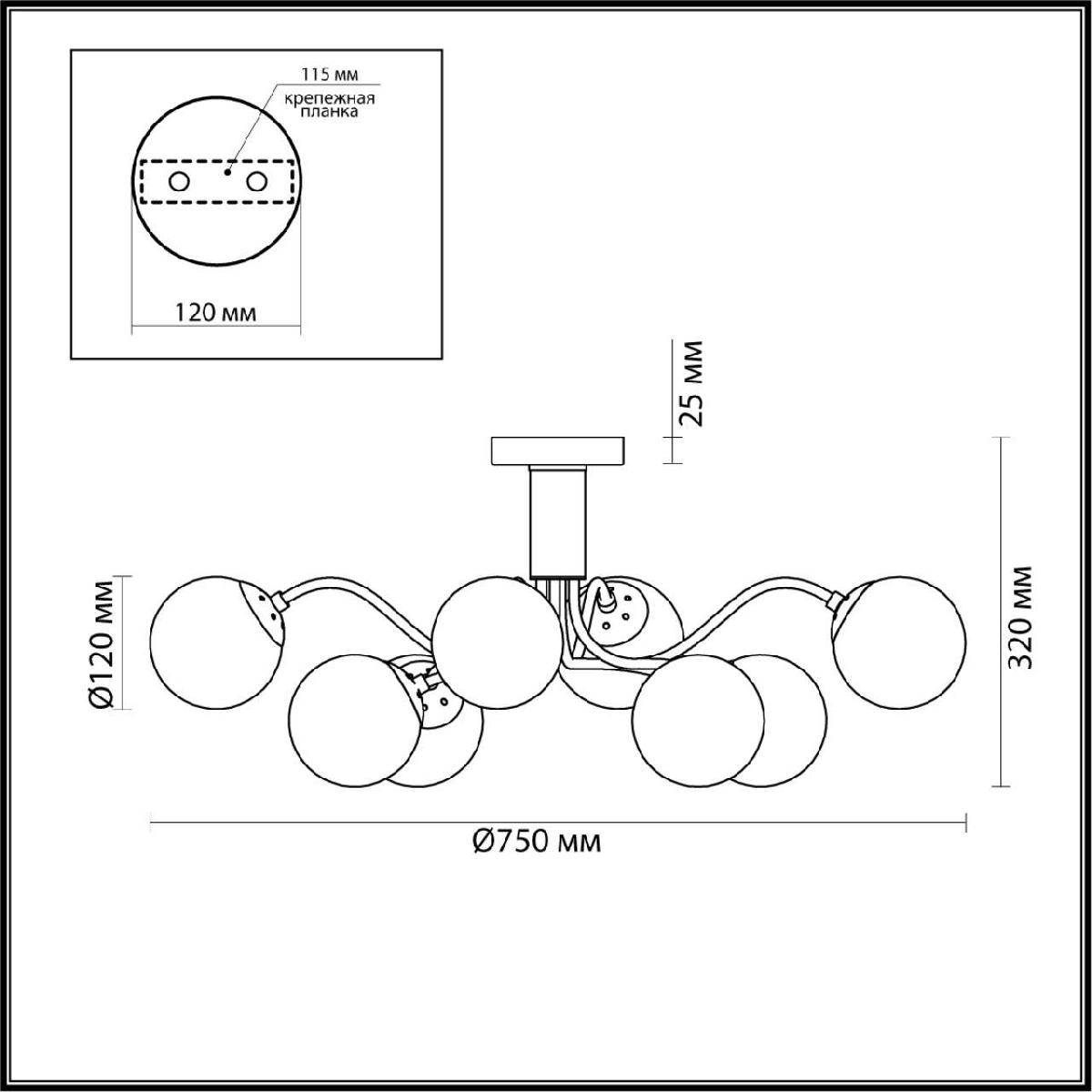 Производитель светильника рекомендует для устройства 8 ламп накаливания с цоколем E14 и мощностью 40 W, что позволит осветить помещение площадью 17,8 кв.м. Габариты изделия: высота – 320 мм, диаметр – 750 мм.