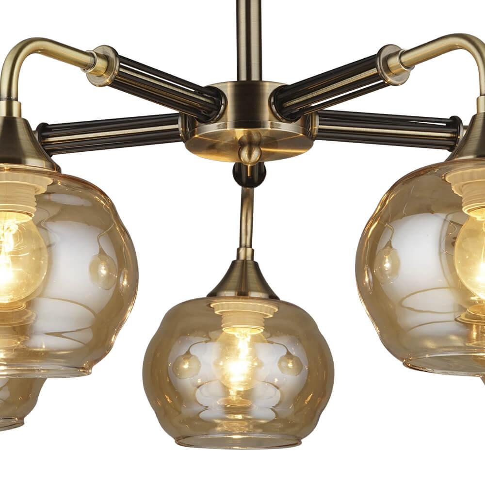 Производитель светильника рекомендует для устройства 5 ламп накаливания с цоколем E27 и мощностью 60 W, что позволит осветить помещение площадью 16,7 кв.м. Габариты изделия: высота – 320 мм, диаметр – 575 мм.