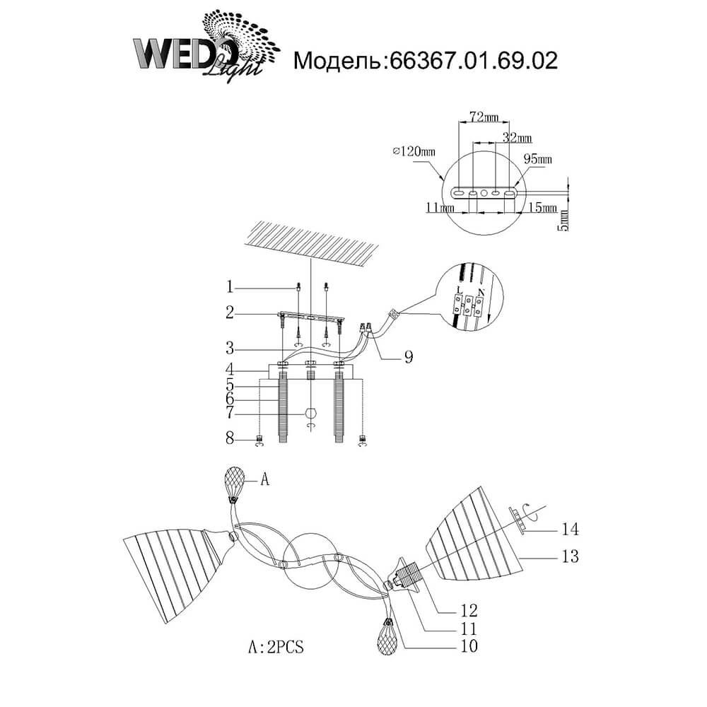 Производитель светильника рекомендует для устройства 2 лампы накаливания с цоколем E27 и мощностью 60 W, что позволит осветить помещение площадью 6,7 кв.м. Габариты изделия: высота – 240 мм, диаметр – мм.