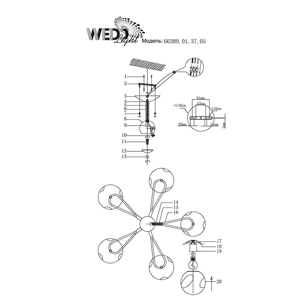 Производитель светильника рекомендует для устройства 5 ламп накаливания с цоколем E27 и мощностью 60 W, что позволит осветить помещение площадью 16,7 кв.м. Габариты изделия: высота – 320 мм, диаметр – 610 мм.