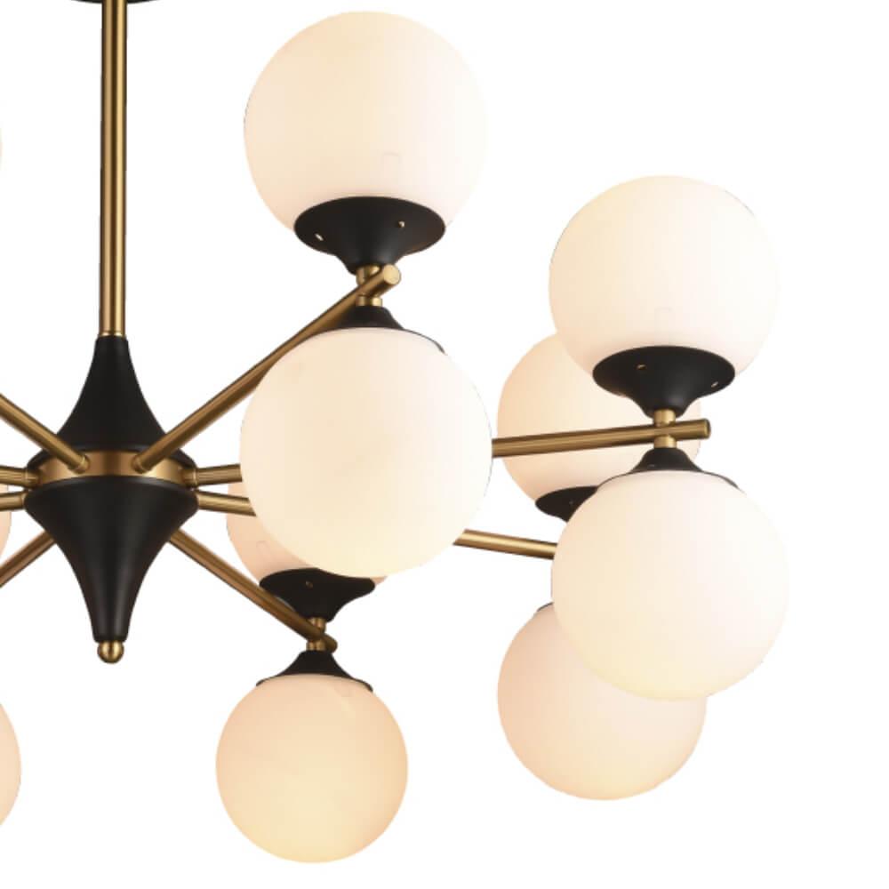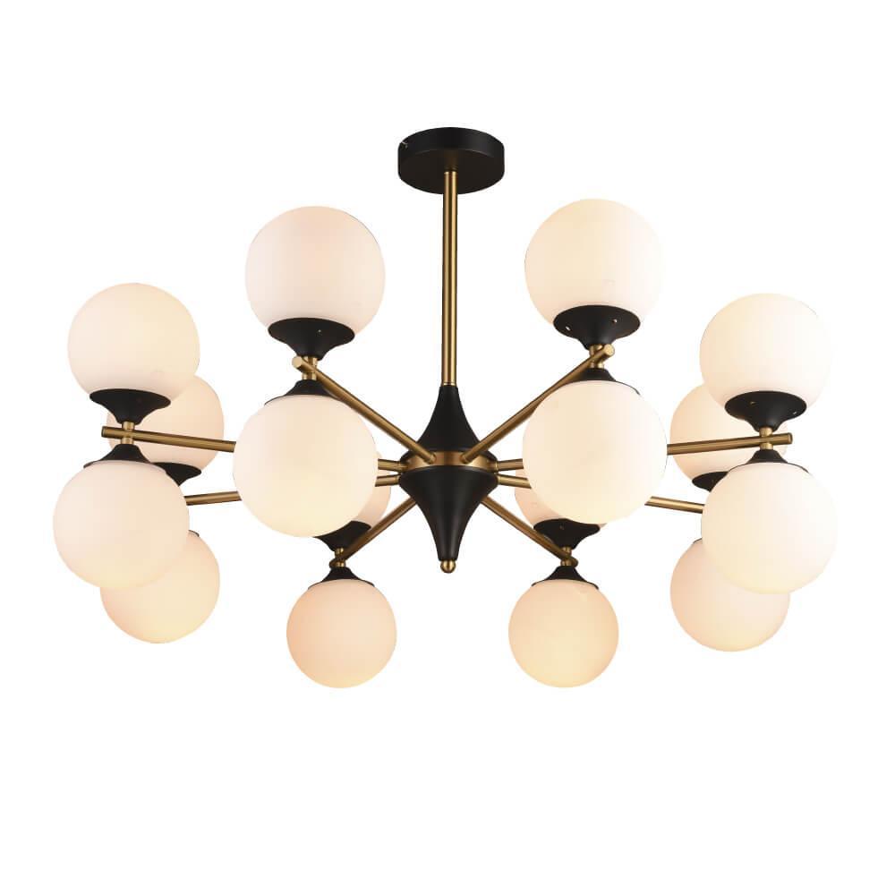 Производитель светильника рекомендует для устройства 16 ламп накаливания с цоколем E27 и мощностью 60 W, что позволит осветить помещение площадью 53,3 кв.м. Габариты изделия: высота – 530 мм, диаметр – 810 мм.