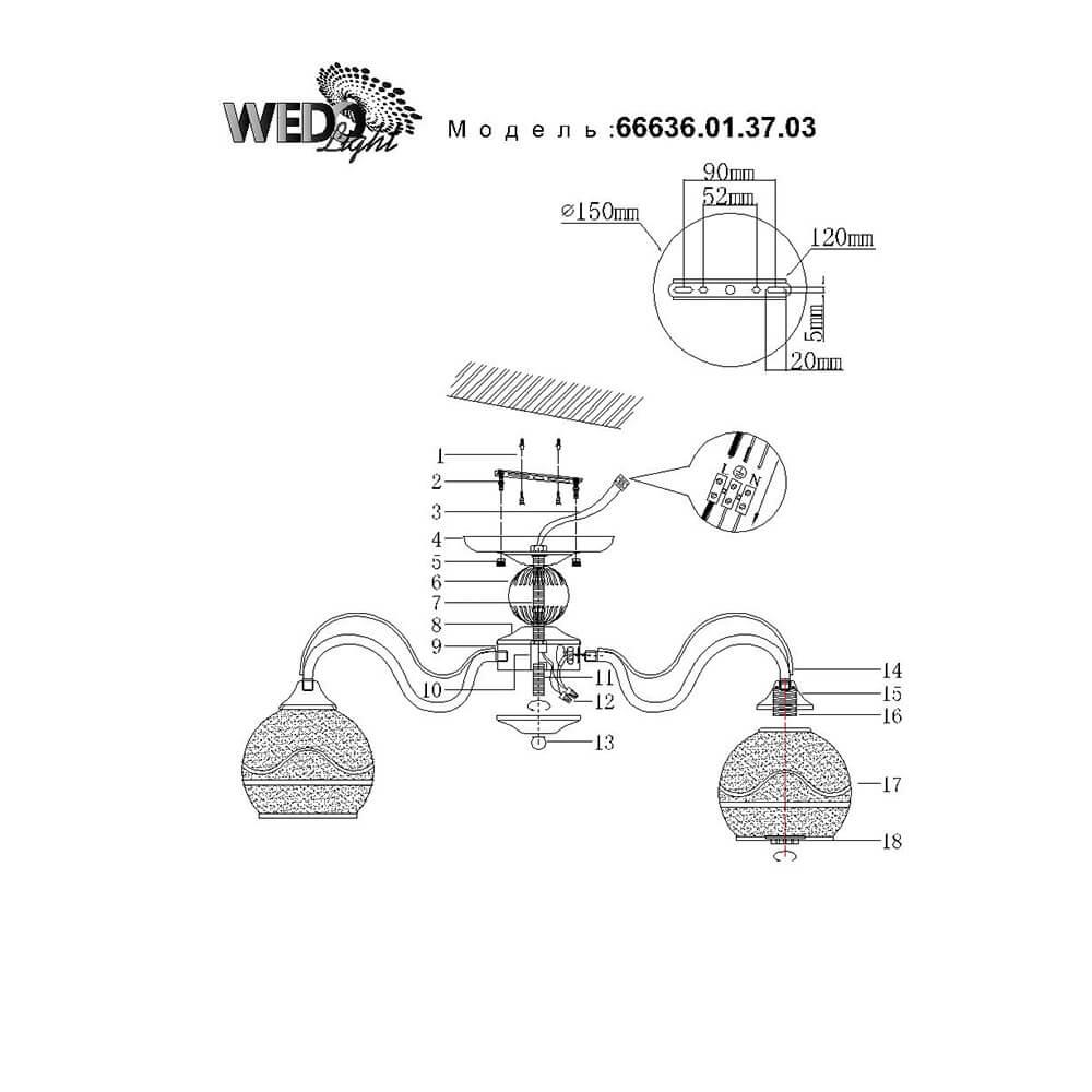 Производитель светильника рекомендует для устройства 3 лампы накаливания с цоколем E27 и мощностью 60 W, что позволит осветить помещение площадью 10 кв.м. Габариты изделия: высота – 275 мм, диаметр – 580 мм.