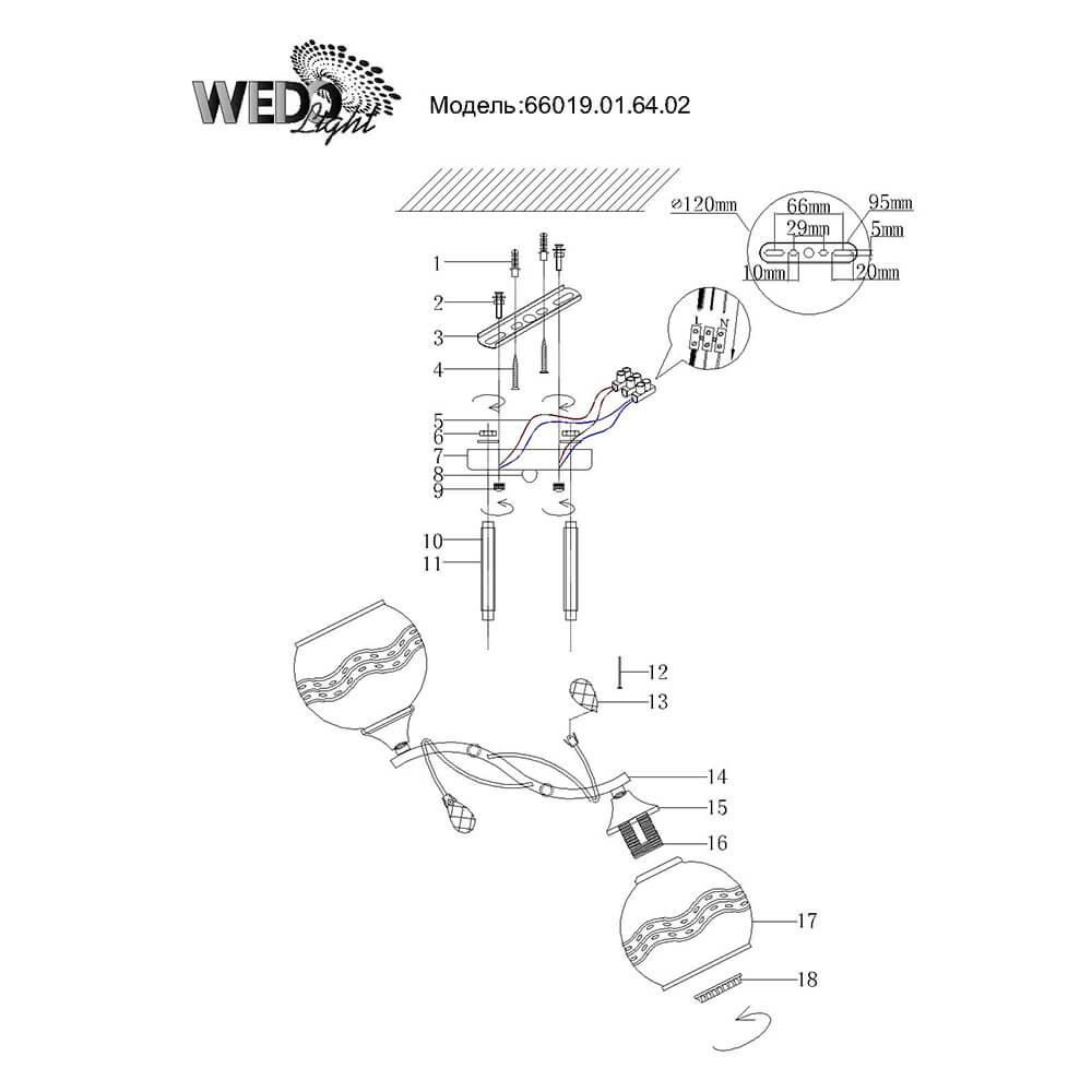 Производитель светильника рекомендует для устройства 2 лампы накаливания с цоколем E27 и мощностью 60 W, что позволит осветить помещение площадью 6,7 кв.м. Габариты изделия: высота – 225 мм, диаметр – мм.