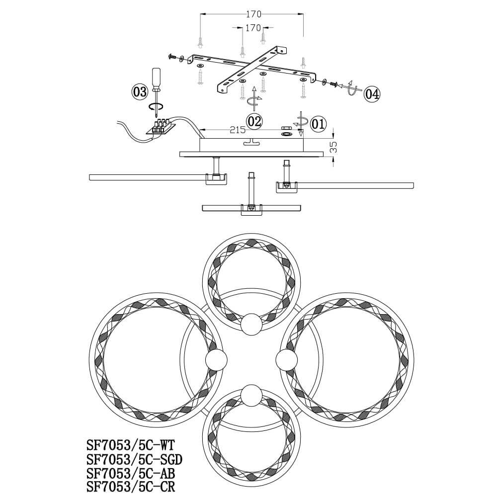 Производитель светильника рекомендует для устройства 5 светодиодных ламп с цоколем LED и мощностью 105 W, что позволит осветить помещение площадью 25 кв.м. Габариты изделия: высота – 100 мм, диаметр – мм.