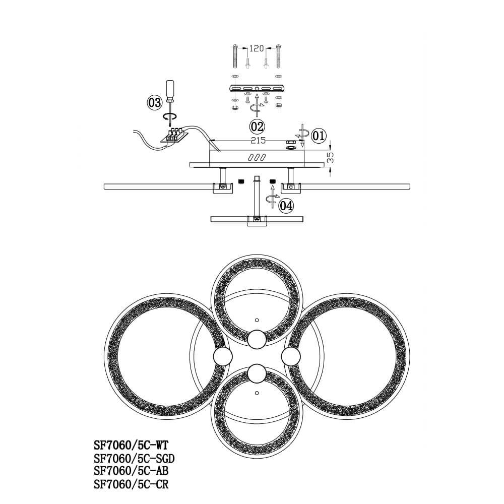 Производитель светильника рекомендует для устройства 7 светодиодных ламп с цоколем LED и мощностью 105 W, что позволит осветить помещение площадью 25 кв.м. Габариты изделия: высота – 130 мм, диаметр – мм.