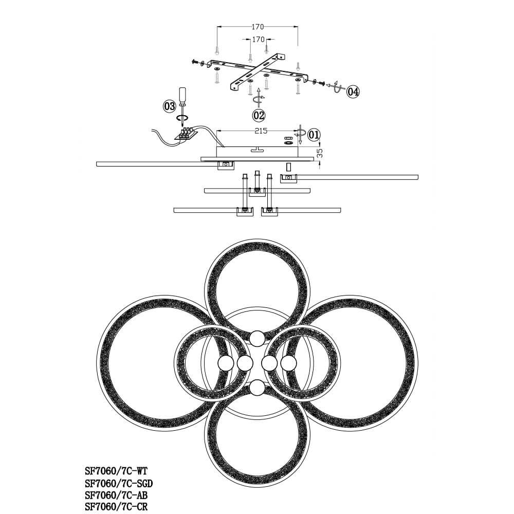 Производитель светильника рекомендует для устройства 7 светодиодных ламп с цоколем LED и мощностью 175 W, что позволит осветить помещение площадью 40 кв.м. Габариты изделия: высота – 130 мм, диаметр – мм.