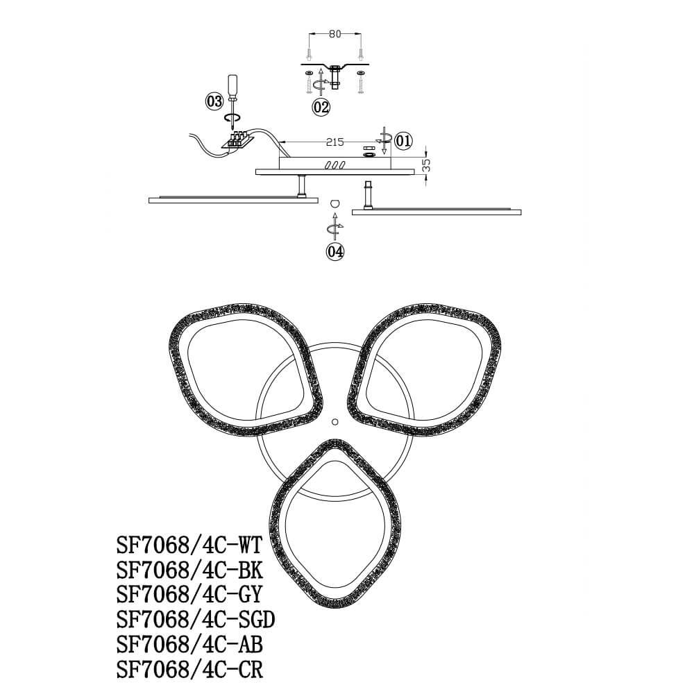 Производитель светильника рекомендует для устройства 4 светодиодные лампы с цоколем LED и мощностью 60 W, что позволит осветить помещение площадью 15 кв.м. Габариты изделия: высота – 90 мм, диаметр – 650 мм.
