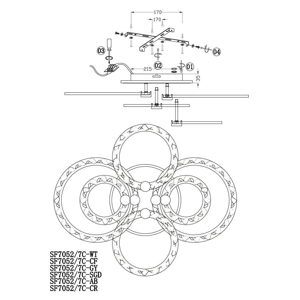 Производитель светильника рекомендует для устройства 7 светодиодных ламп с цоколем LED и мощностью 135 W, что позволит осветить помещение площадью 30 кв.м. Габариты изделия: высота – 130 мм, диаметр – мм.