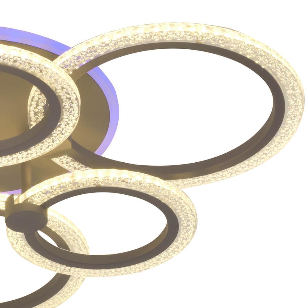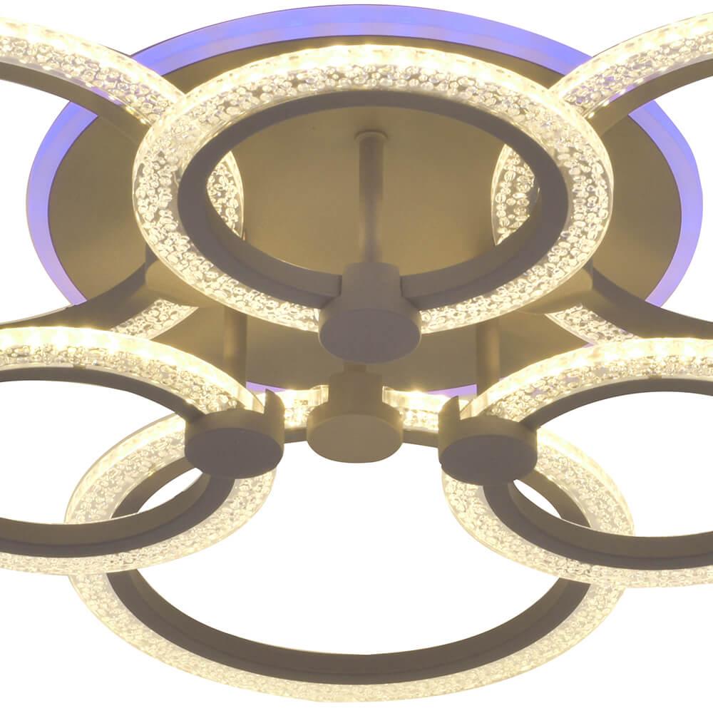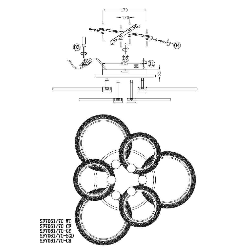 Производитель светильника рекомендует для устройства 7 светодиодных ламп с цоколем LED и мощностью 110 W, что позволит осветить помещение площадью 25 кв.м. Габариты изделия: высота – 130 мм, диаметр – 640 мм.