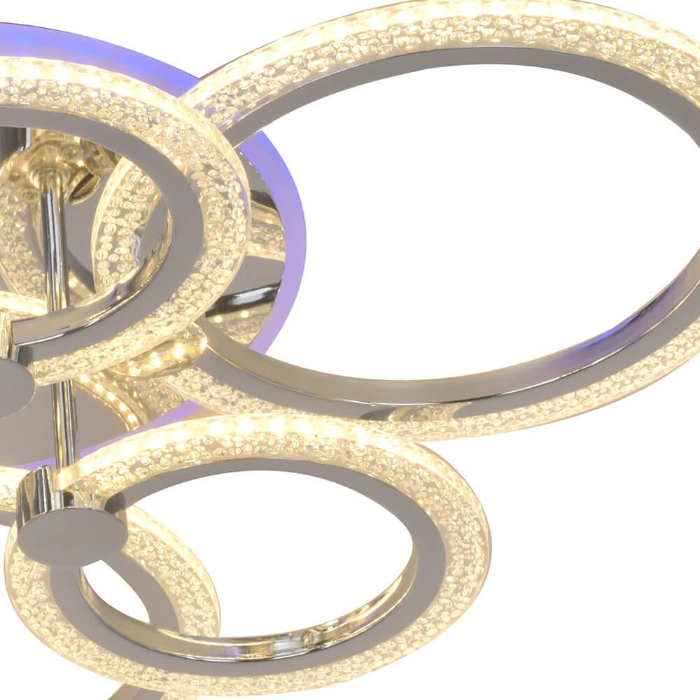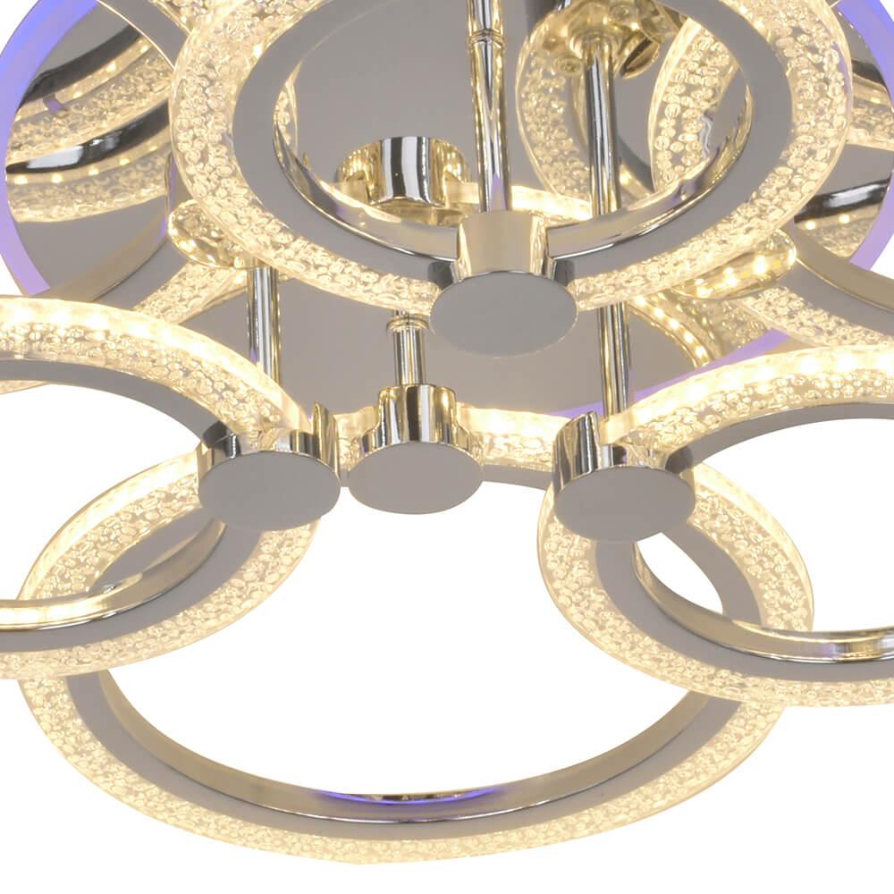 Производитель светильника рекомендует для устройства 7 светодиодных ламп с цоколем LED и мощностью 110 W, что позволит осветить помещение площадью 25 кв.м. Габариты изделия: высота – 130 мм, диаметр – 640 мм.