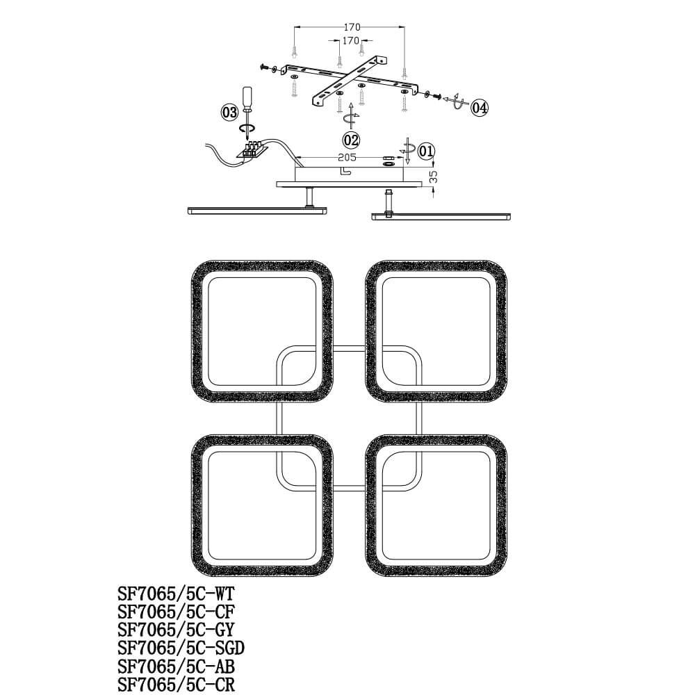 Производитель светильника рекомендует для устройства 5 светодиодных ламп с цоколем LED и мощностью 100 W, что позволит осветить помещение площадью 25 кв.м. Габариты изделия: высота – 85 мм, диаметр – мм.