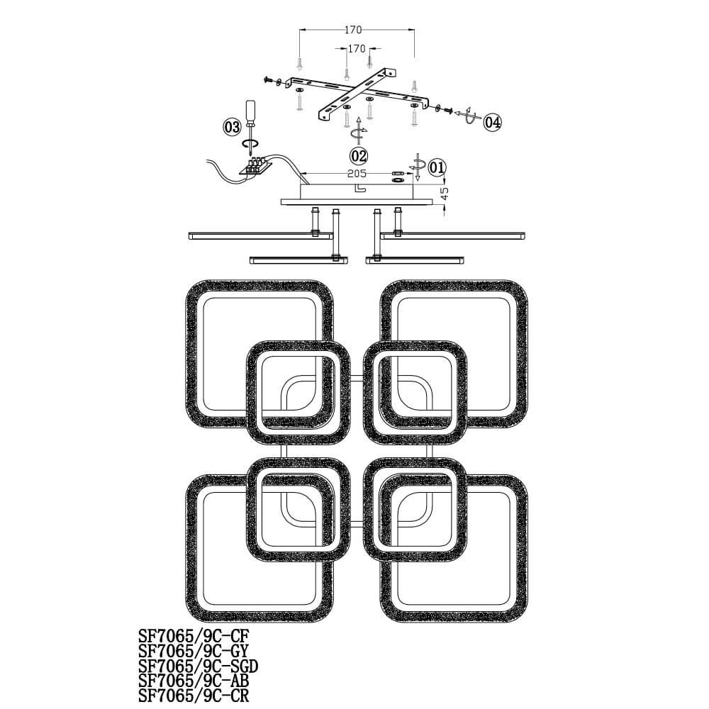 Производитель светильника рекомендует для устройства 9 светодиодных ламп с цоколем LED и мощностью 155 W, что позволит осветить помещение площадью 35 кв.м. Габариты изделия: высота – 125 мм, диаметр – мм.