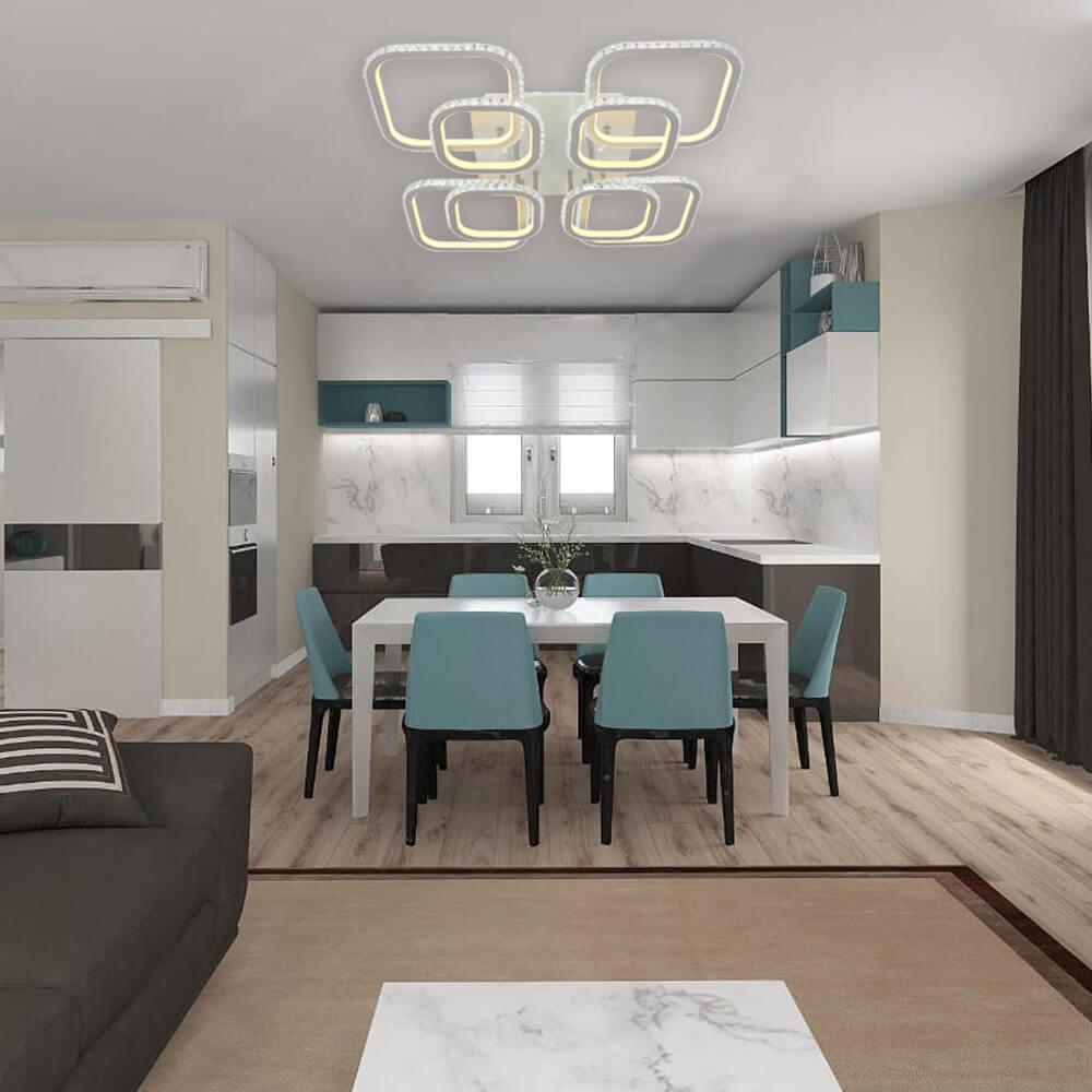 Производитель светильника рекомендует для устройства 8 светодиодных ламп с цоколем LED и мощностью 408 W, что позволит осветить помещение площадью 120 кв.м. Габариты изделия: высота – 140 мм, диаметр – мм.