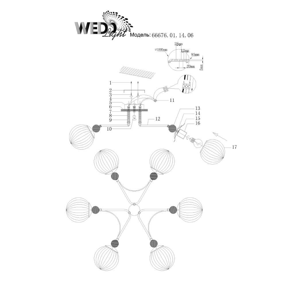 Производитель светильника рекомендует для устройства 6 ламп накаливания с цоколем E27 и мощностью 60 W, что позволит осветить помещение площадью 18 кв.м. Габариты изделия: высота – 230 мм, диаметр – 680 мм.