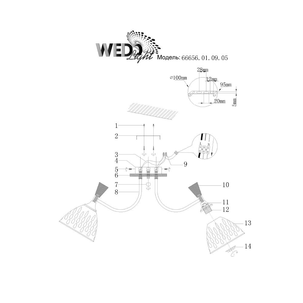 Производитель светильника рекомендует для устройства 5 ламп накаливания с цоколем E27 и мощностью 60 W, что позволит осветить помещение площадью 15 кв.м. Габариты изделия: высота – 280 мм, диаметр – 675 мм.