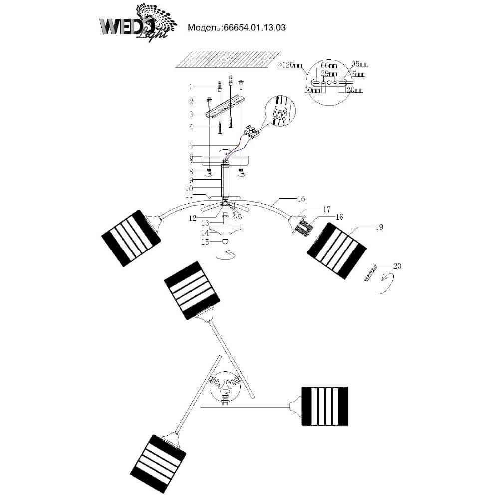 Производитель светильника рекомендует для устройства 3 лампы накаливания с цоколем E27 и мощностью 60 W, что позволит осветить помещение площадью 9 кв.м. Габариты изделия: высота – 280 мм, диаметр – 640 мм.