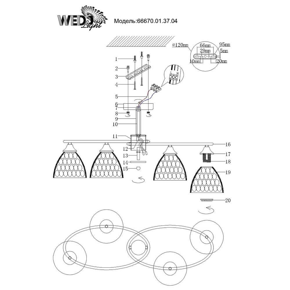 Производитель светильника рекомендует для устройства 4 лампы накаливания с цоколем E27 и мощностью 60 W, что позволит осветить помещение площадью 12 кв.м. Габариты изделия: высота – 285 мм, диаметр – мм.