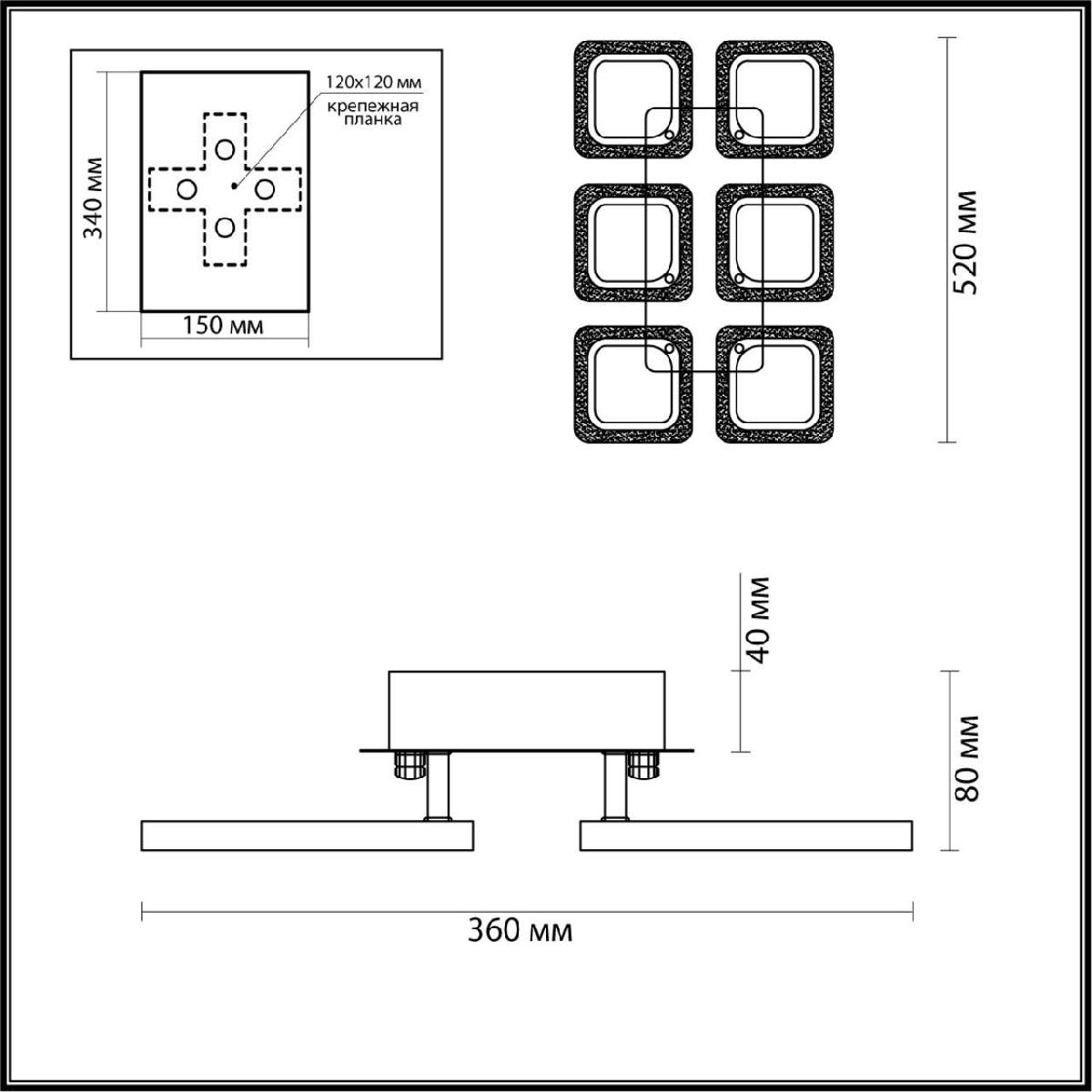 Производитель светильника рекомендует для устройства светодиодных ламп с цоколем LED и мощностью W, что позволит осветить помещение площадью кв.м. Габариты изделия: высота – 80 мм, диаметр – мм.