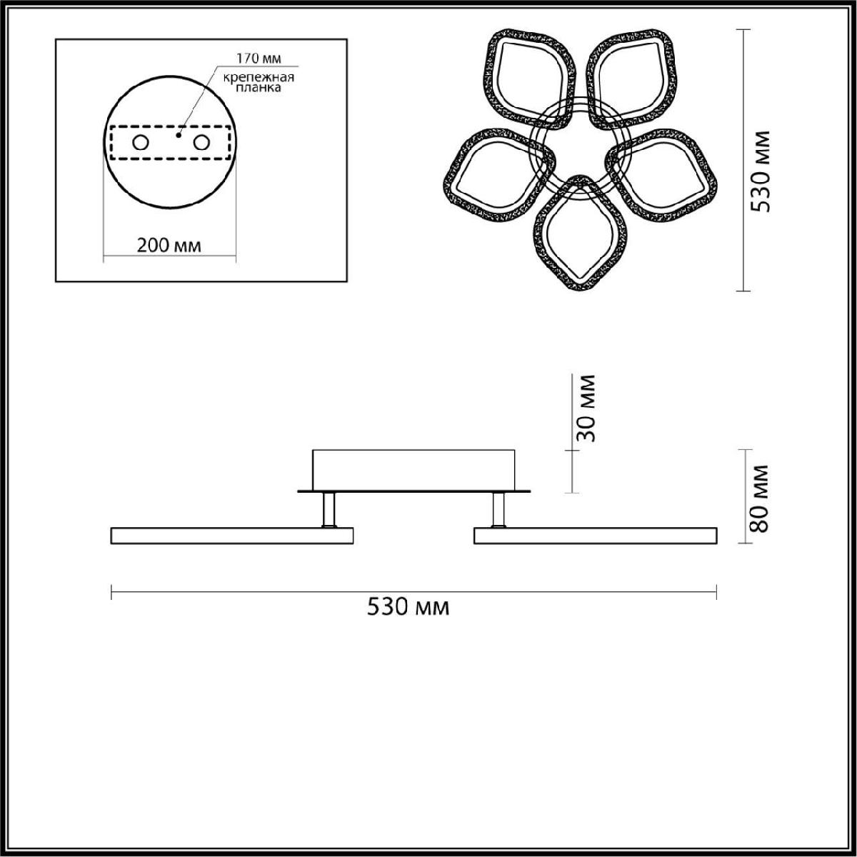 Производитель светильника рекомендует для устройства светодиодных ламп с цоколем LED и мощностью 90 W, что позволит осветить помещение площадью кв.м. Габариты изделия: высота – 80 мм, диаметр – 530 мм.
