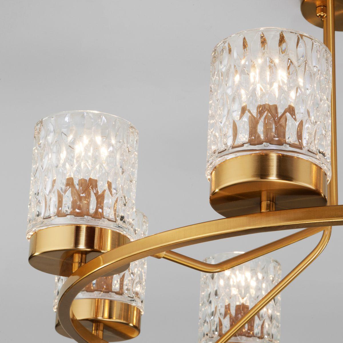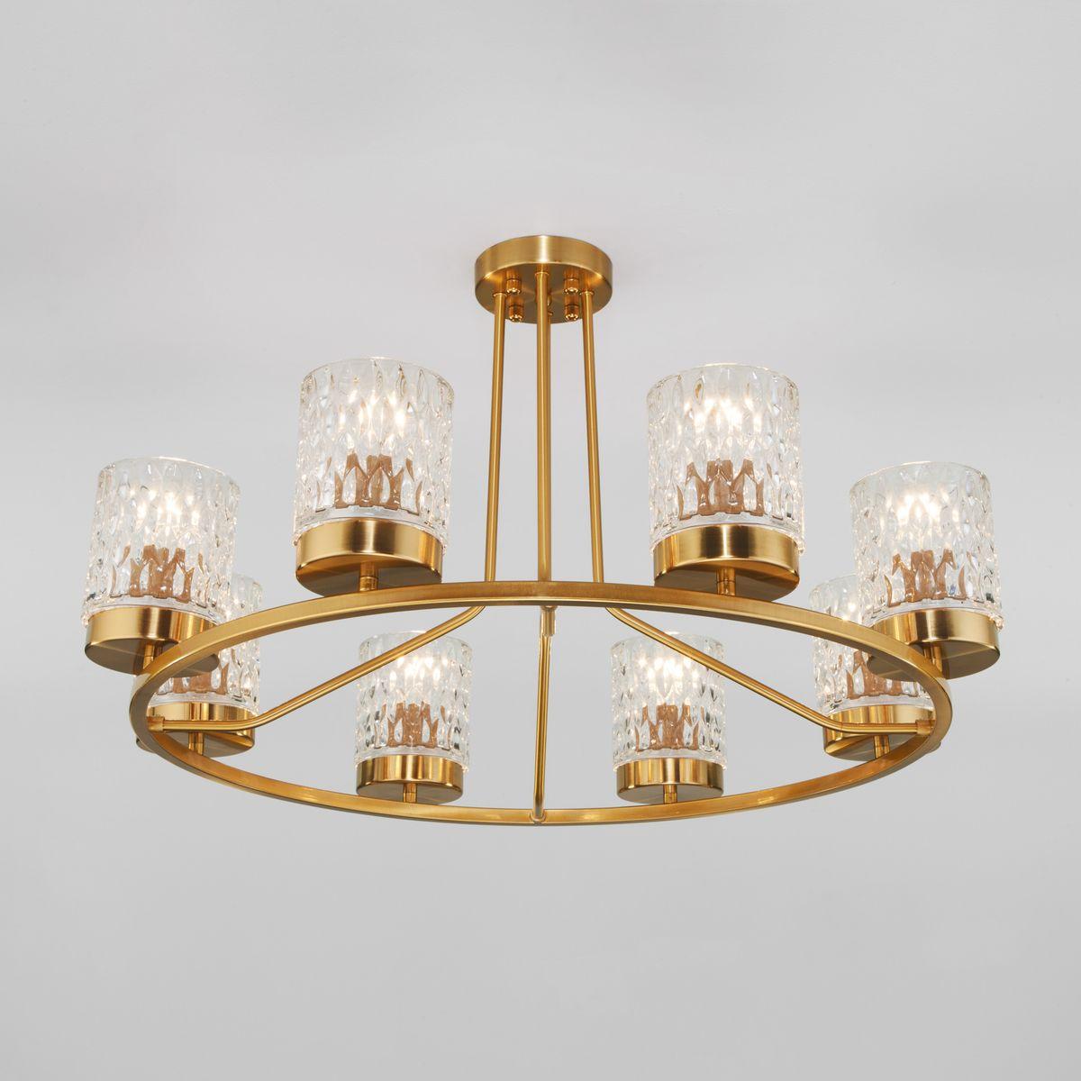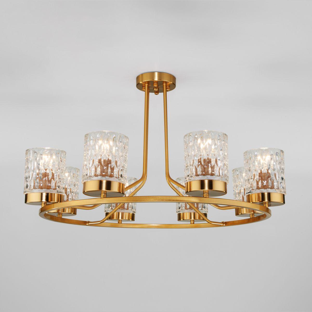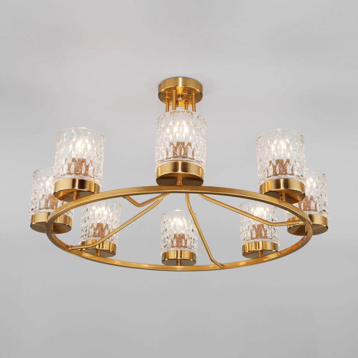 Потолочная люстра Eurosvet Calle 60127/8 латунь от Китайского бренда из коллекции Calle будет удачно смотреться в гостиной в стиле модерн. Светильник выполнен из стекла с плафонами в форме прозрачного цвета.