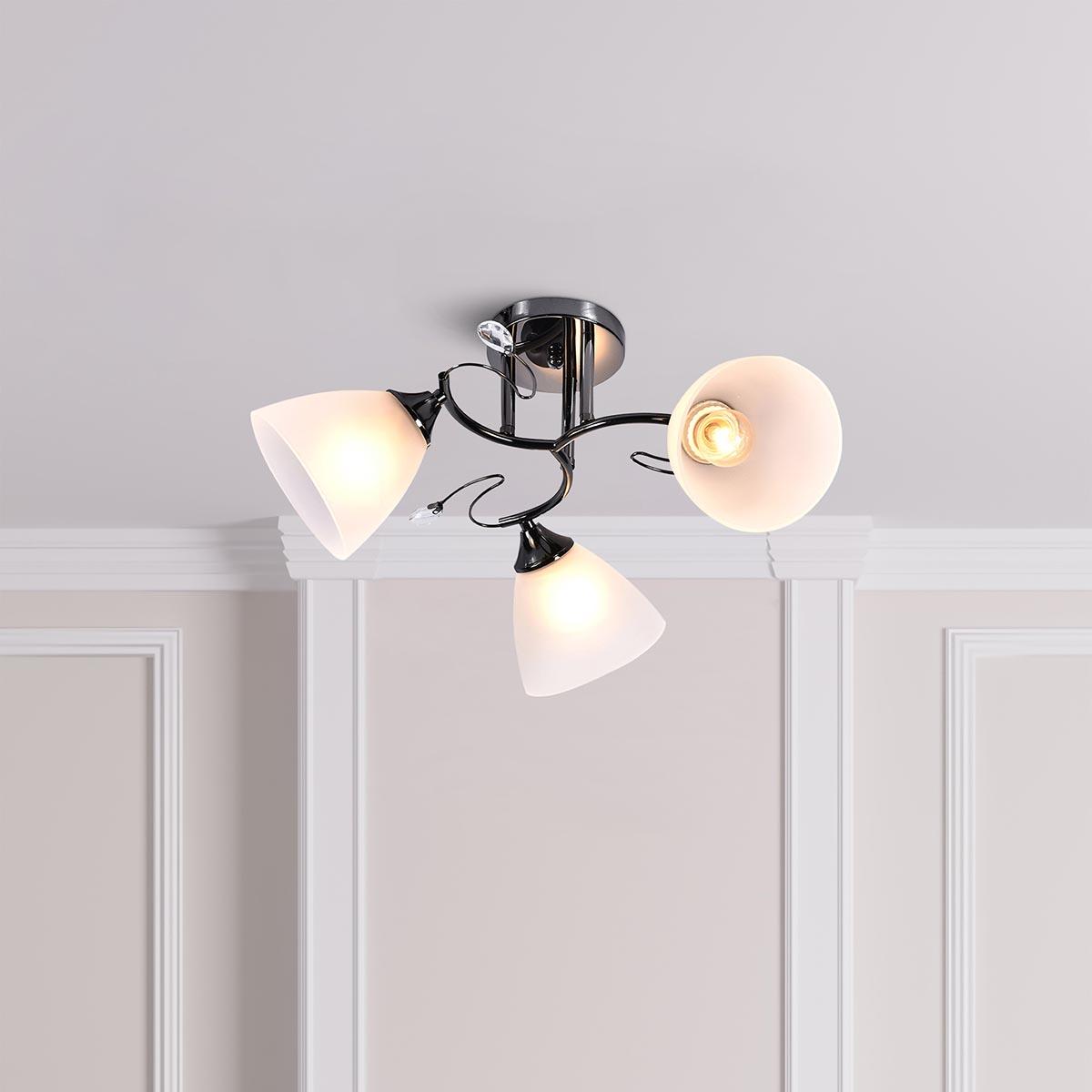 Производитель светильника рекомендует для устройства 3 лампы накаливания с цоколем E27 и мощностью 60 W, что позволит осветить помещение площадью 10 кв.м. Габариты изделия: высота – 250 мм, диаметр – 520 мм.