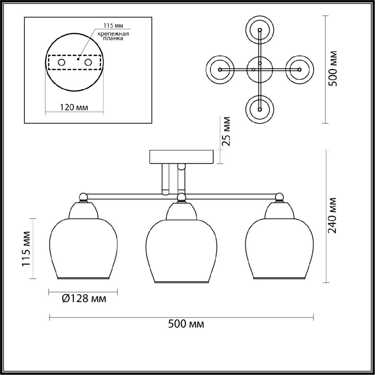 Производитель светильника рекомендует для устройства 4 лампы накаливания с цоколем E27 и мощностью 60 W, что позволит осветить помещение площадью 12 кв.м. Габариты изделия: высота – 240 мм, диаметр – 500 мм.