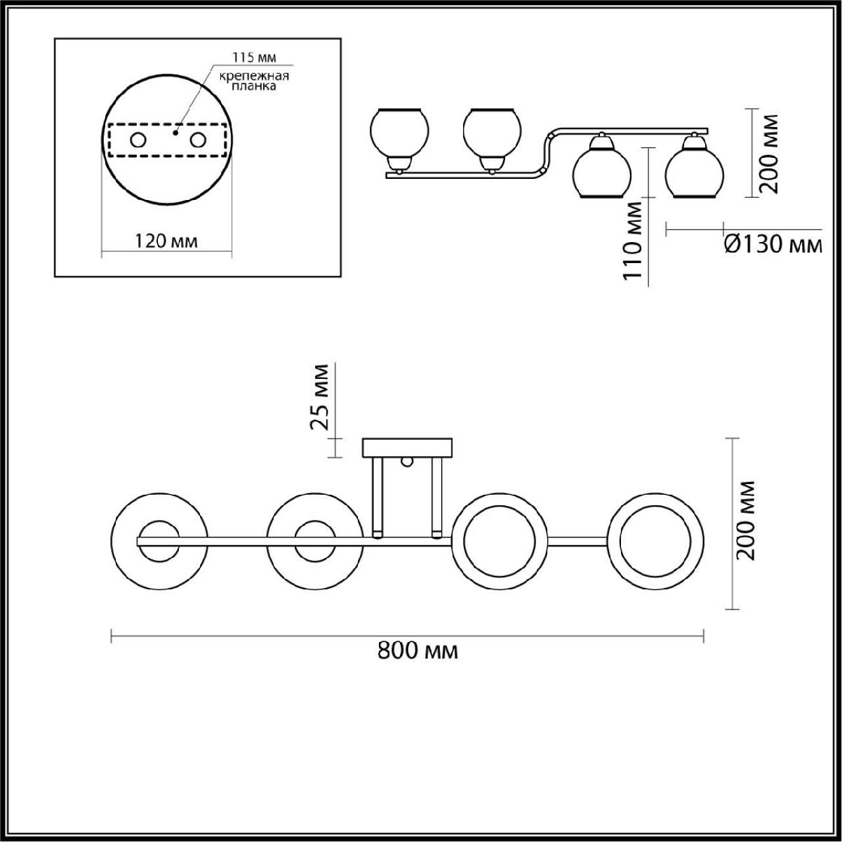 Производитель светильника рекомендует для устройства 4 лампы накаливания с цоколем E27 и мощностью 60 W, что позволит осветить помещение площадью 12 кв.м. Габариты изделия: высота – 200 мм, диаметр – мм.