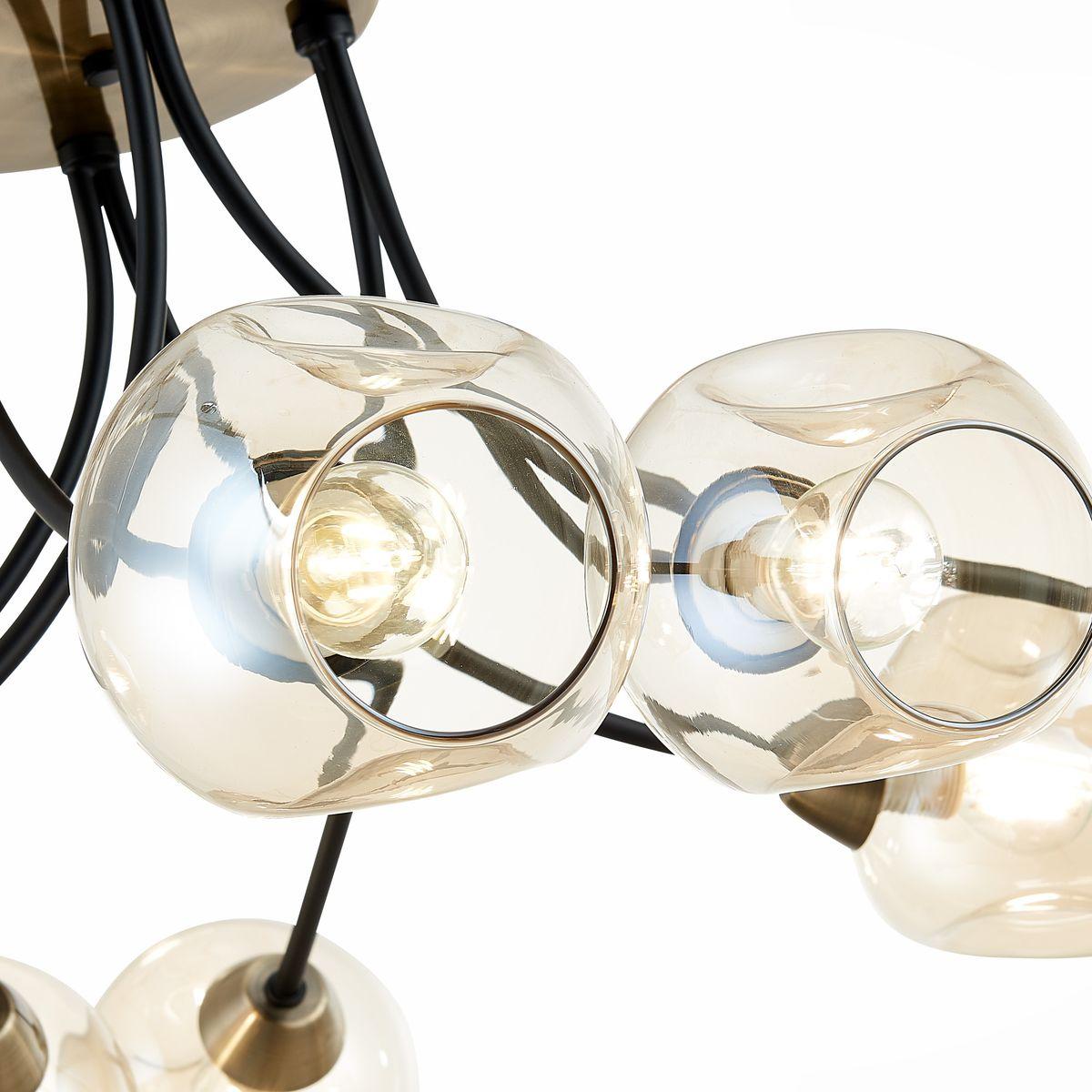 Производитель светильника рекомендует для устройства 8 ламп накаливания с цоколем E14 и мощностью 40 W, что позволит осветить помещение площадью 16 кв.м. Габариты изделия: высота – 350 мм, диаметр – 910 мм.