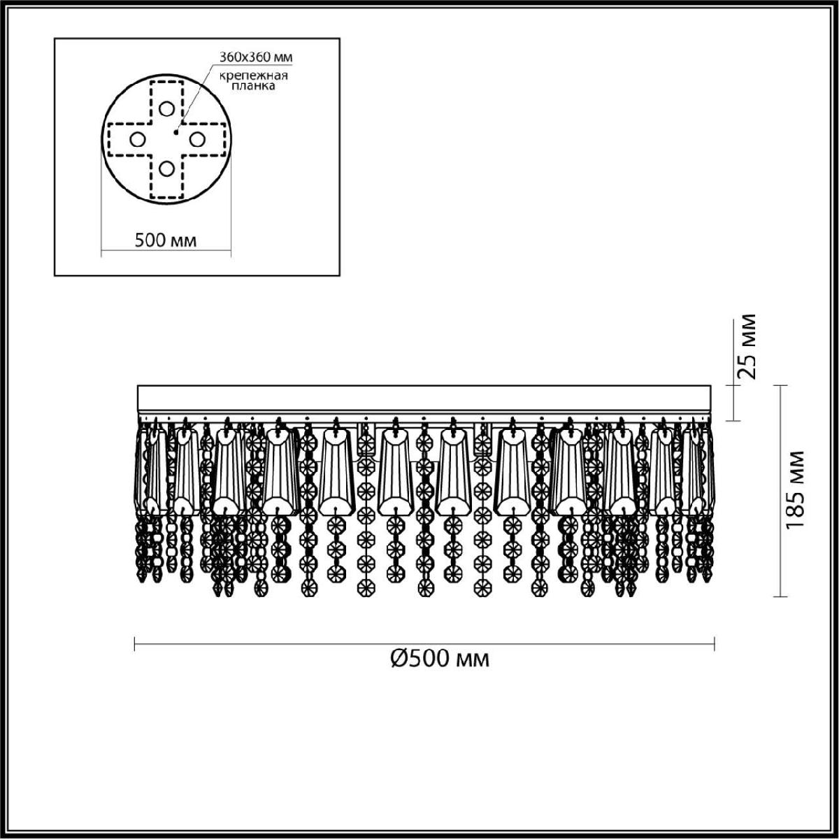 Производитель светильника рекомендует для устройства 5 ламп накаливания с цоколем E14 и мощностью 40 W, что позволит осветить помещение площадью 12 кв.м. Габариты изделия: высота – 185 мм, диаметр – 500 мм.