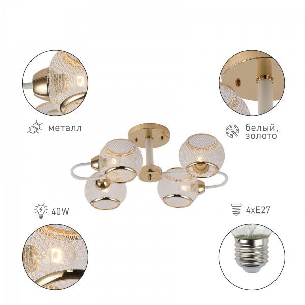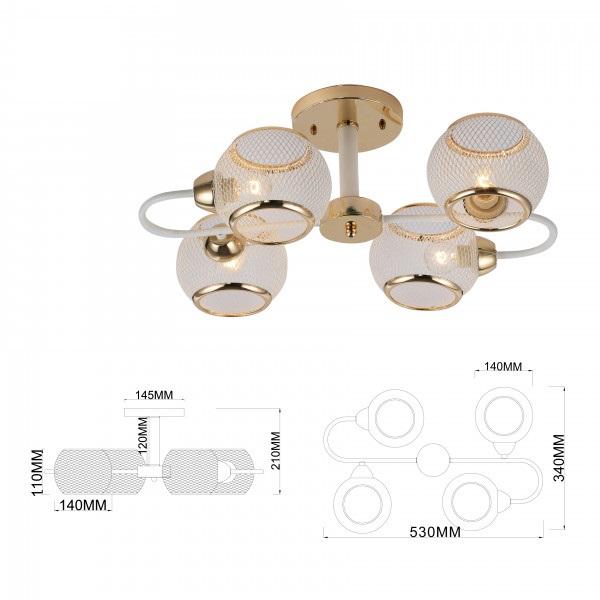 Производитель светильника рекомендует для устройства 4 светодиодные лампы с цоколем E27 и мощностью 40 W, что позволит осветить помещение площадью 12 кв.м. Габариты изделия: высота – 210 мм, диаметр – мм.