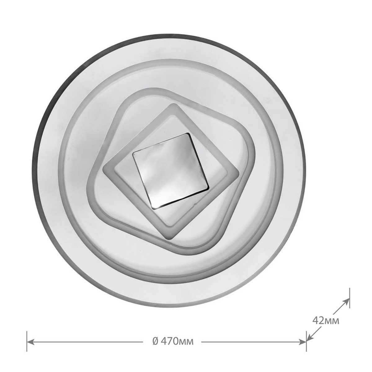 Производитель светильника рекомендует для устройства светодиодных ламп с цоколем LED и мощностью W, что позволит осветить помещение площадью кв.м. Габариты изделия: высота – 42 мм, диаметр – 470 мм.