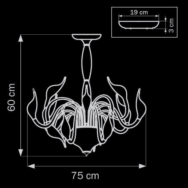 Производитель светильника рекомендует для устройства 12 галогеновых ламп с цоколем G4 и мощностью 20 W, что позволит осветить помещение площадью 13,3 кв.м. Габариты изделия: высота – 600 мм, диаметр – 750 мм.