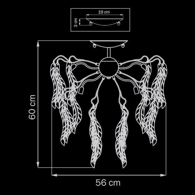 Производитель светильника рекомендует для устройства 9 галогеновых ламп с цоколем G9 и мощностью 40 W, что позволит осветить помещение площадью 20 кв.м. Габариты изделия: высота – 600 мм, диаметр – 560 мм.