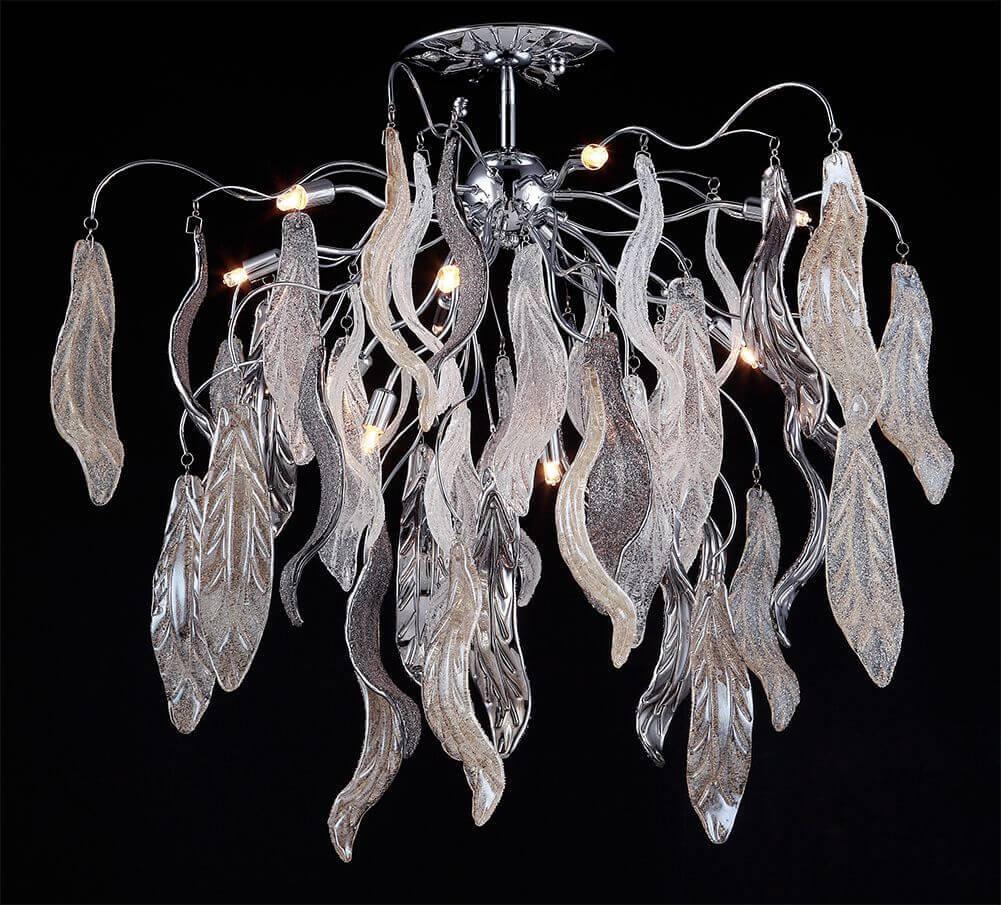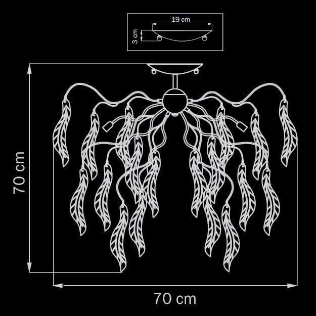 Производитель светильника рекомендует для устройства 12 галогеновых ламп с цоколем G9 и мощностью 40 W, что позволит осветить помещение площадью 26,7 кв.м. Габариты изделия: высота – 700 мм, диаметр – 700 мм.