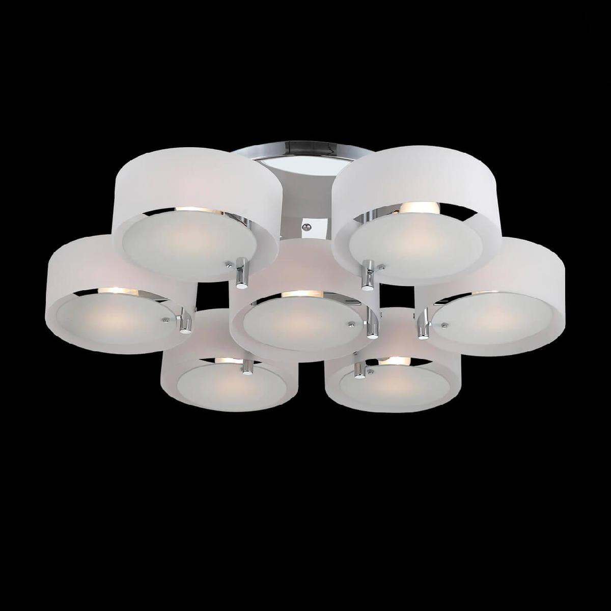 Производитель светильника рекомендует для устройства 7 ламп накаливания с цоколем E27 и мощностью 60 W, что позволит осветить помещение площадью 23 кв.м. Габариты изделия: высота – 200 мм, диаметр – 900 мм.