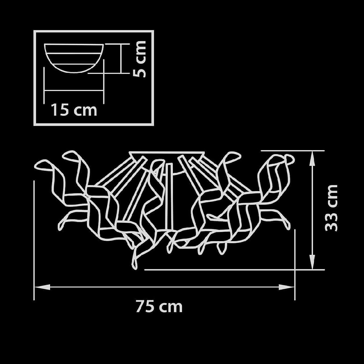 Производитель светильника рекомендует для устройства 6 галогеновых ламп с цоколем G9 и мощностью 40 W, что позволит осветить помещение площадью 13,3 кв.м. Габариты изделия: высота – 330 мм, диаметр – 750 мм.