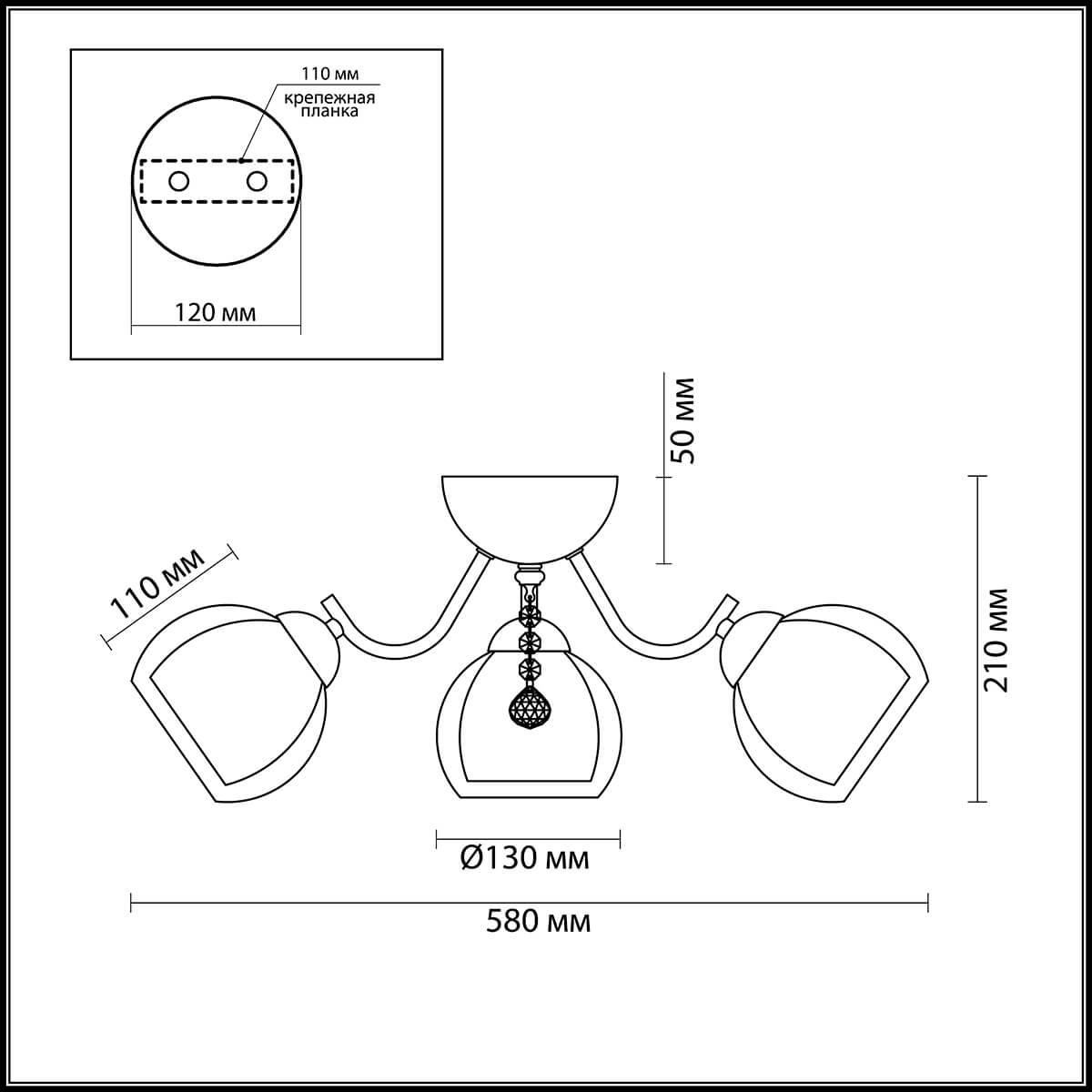 Производитель светильника рекомендует для устройства 3 лампы накаливания с цоколем E27 и мощностью 40 W, что позволит осветить помещение площадью 6,7 кв.м. Габариты изделия: высота – 210 мм, диаметр – 520 мм.