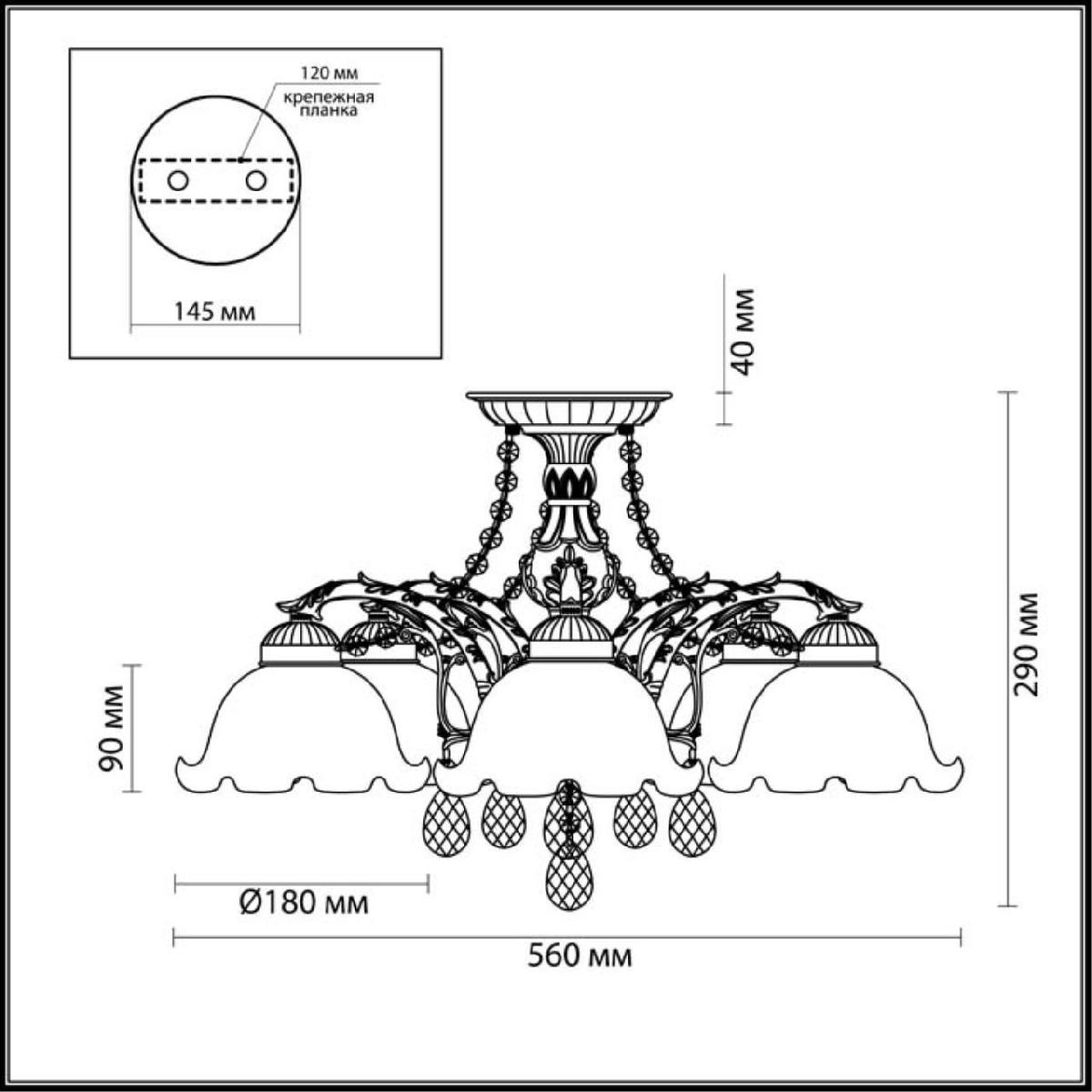 Производитель светильника рекомендует для устройства 5 ламп накаливания с цоколем E27 и мощностью 60 W, что позволит осветить помещение площадью 16,7 кв.м. Габариты изделия: высота – 360 мм, диаметр – 620 мм.