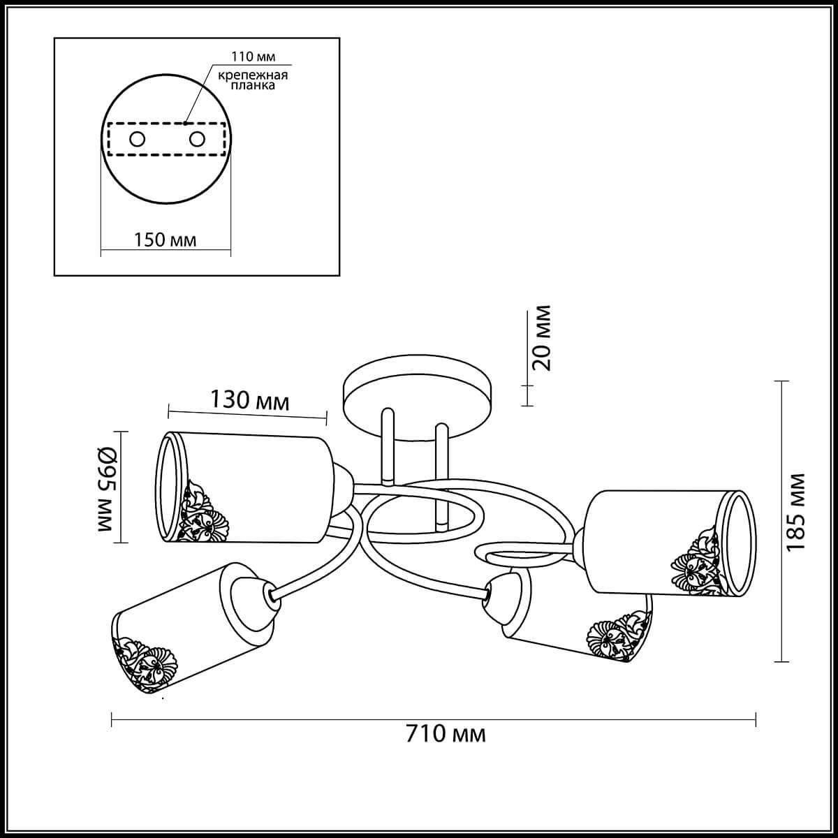 Производитель светильника рекомендует для устройства 4 лампы накаливания с цоколем E27 и мощностью 40 W, что позволит осветить помещение площадью 8,9 кв.м. Габариты изделия: высота – 210 мм, диаметр – 610 мм.