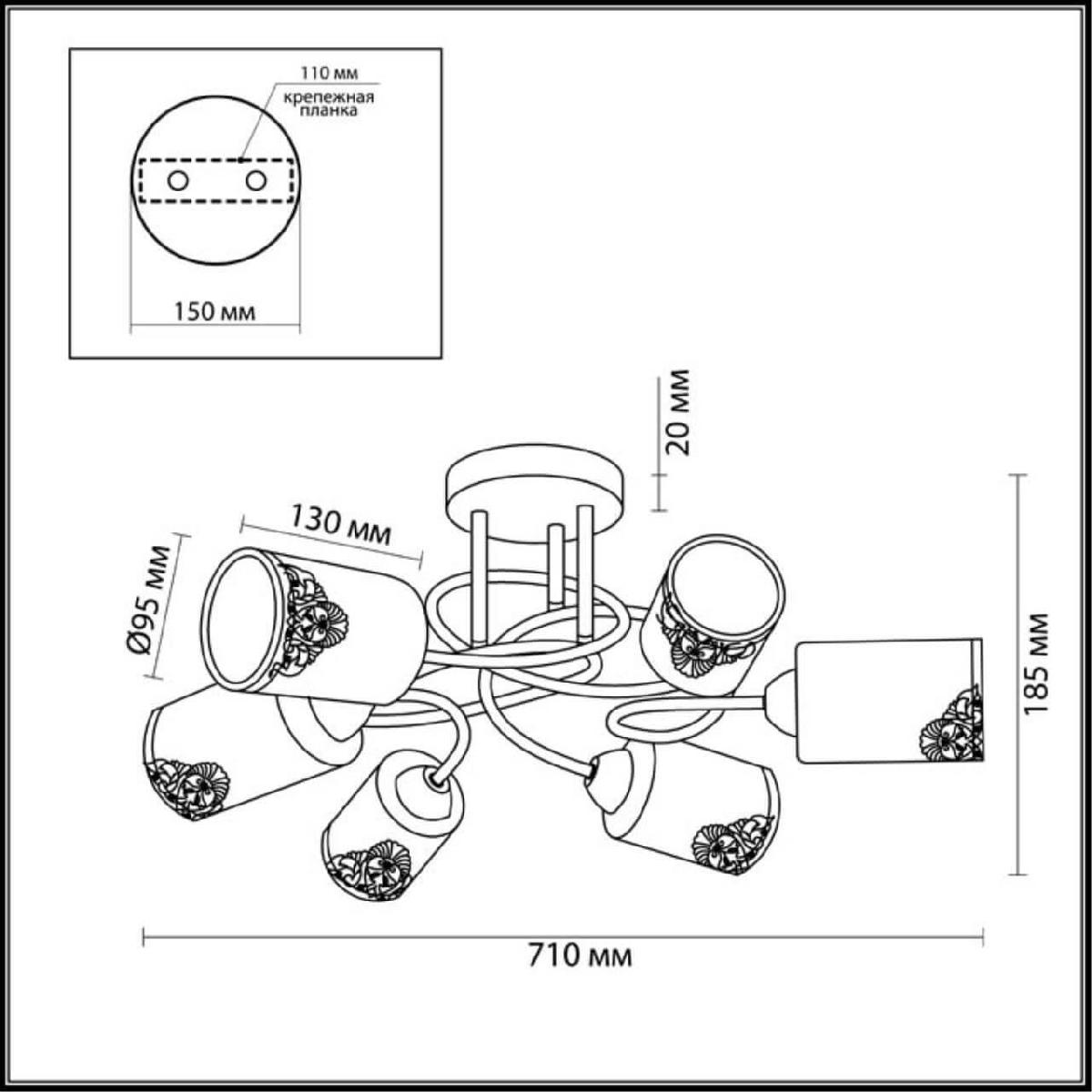 Производитель светильника рекомендует для устройства 6 ламп накаливания с цоколем E27 и мощностью 40 W, что позволит осветить помещение площадью 13,3 кв.м. Габариты изделия: высота – 185 мм, диаметр – 710 мм.