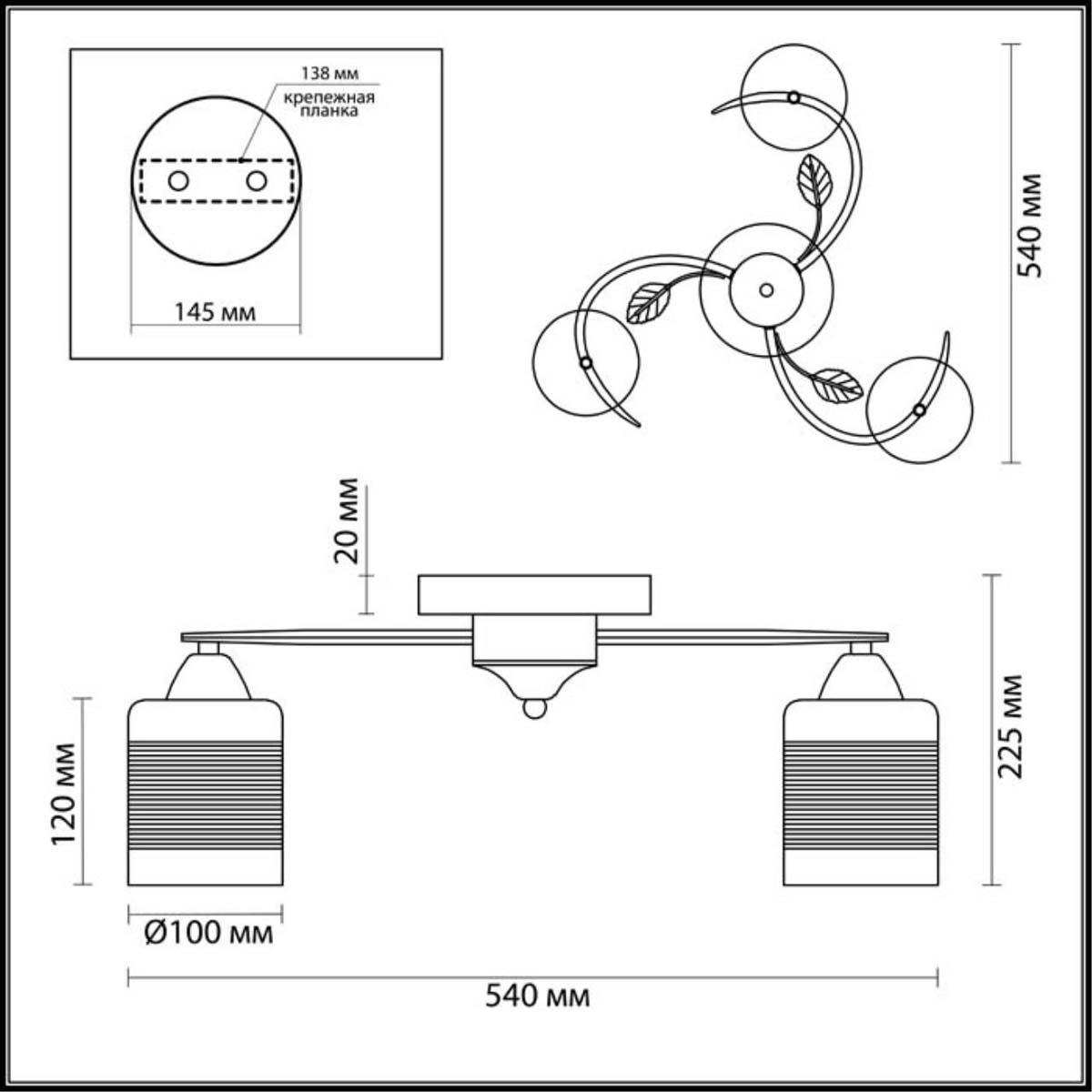 Производитель светильника рекомендует для устройства 3 лампы накаливания с цоколем E27 и мощностью 60 W, что позволит осветить помещение площадью 10 кв.м. Габариты изделия: высота – 230 мм, диаметр – 520 мм.